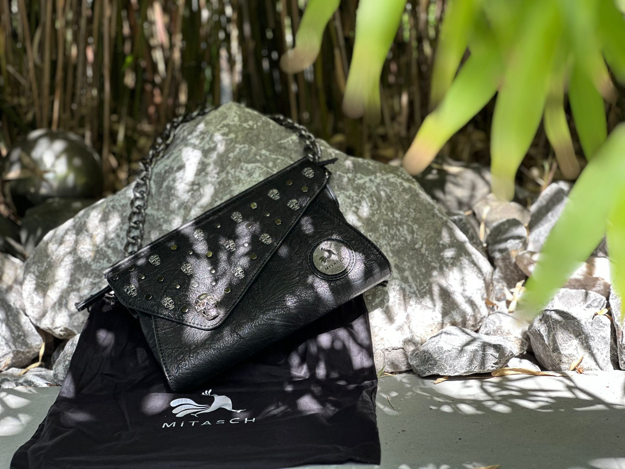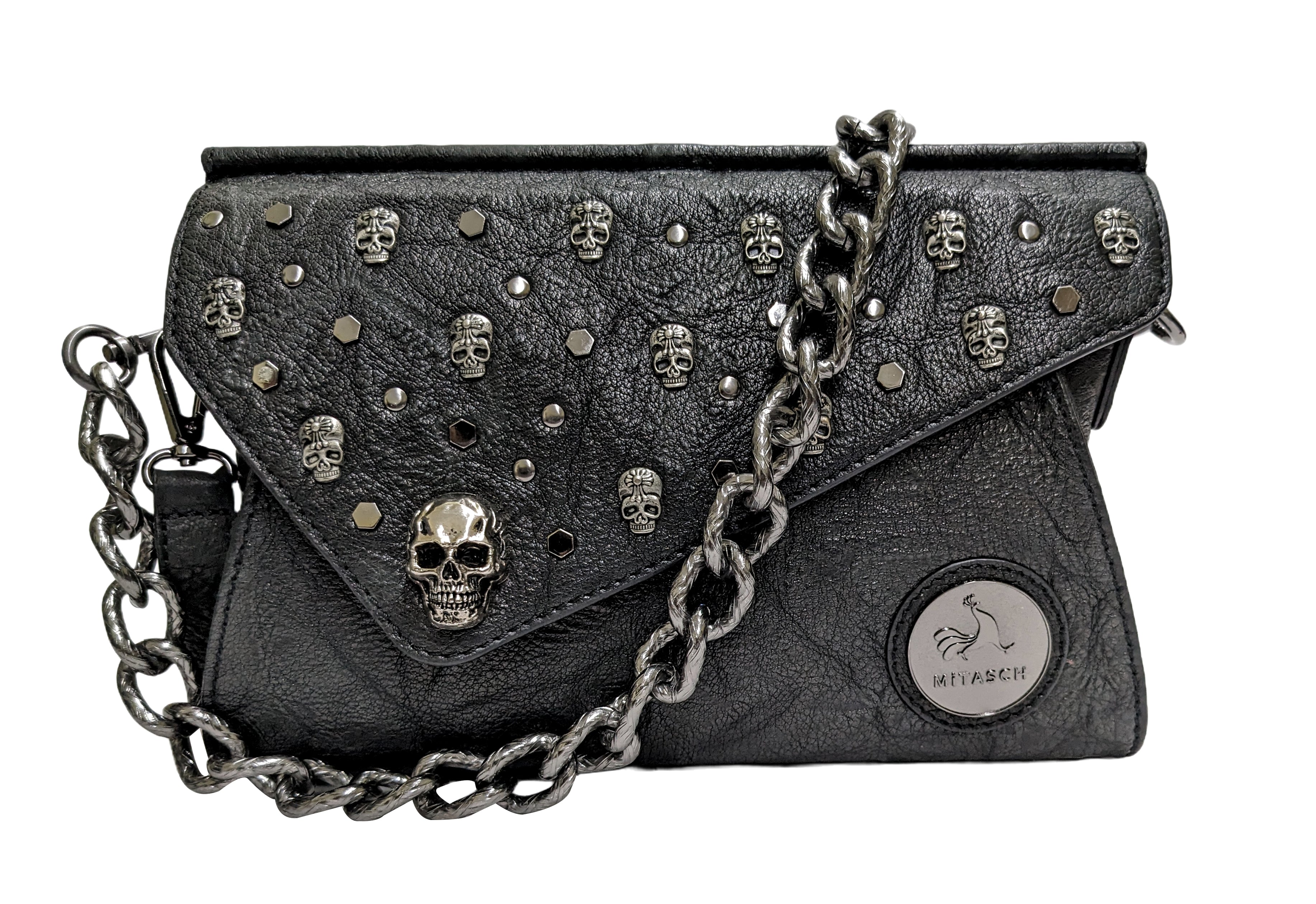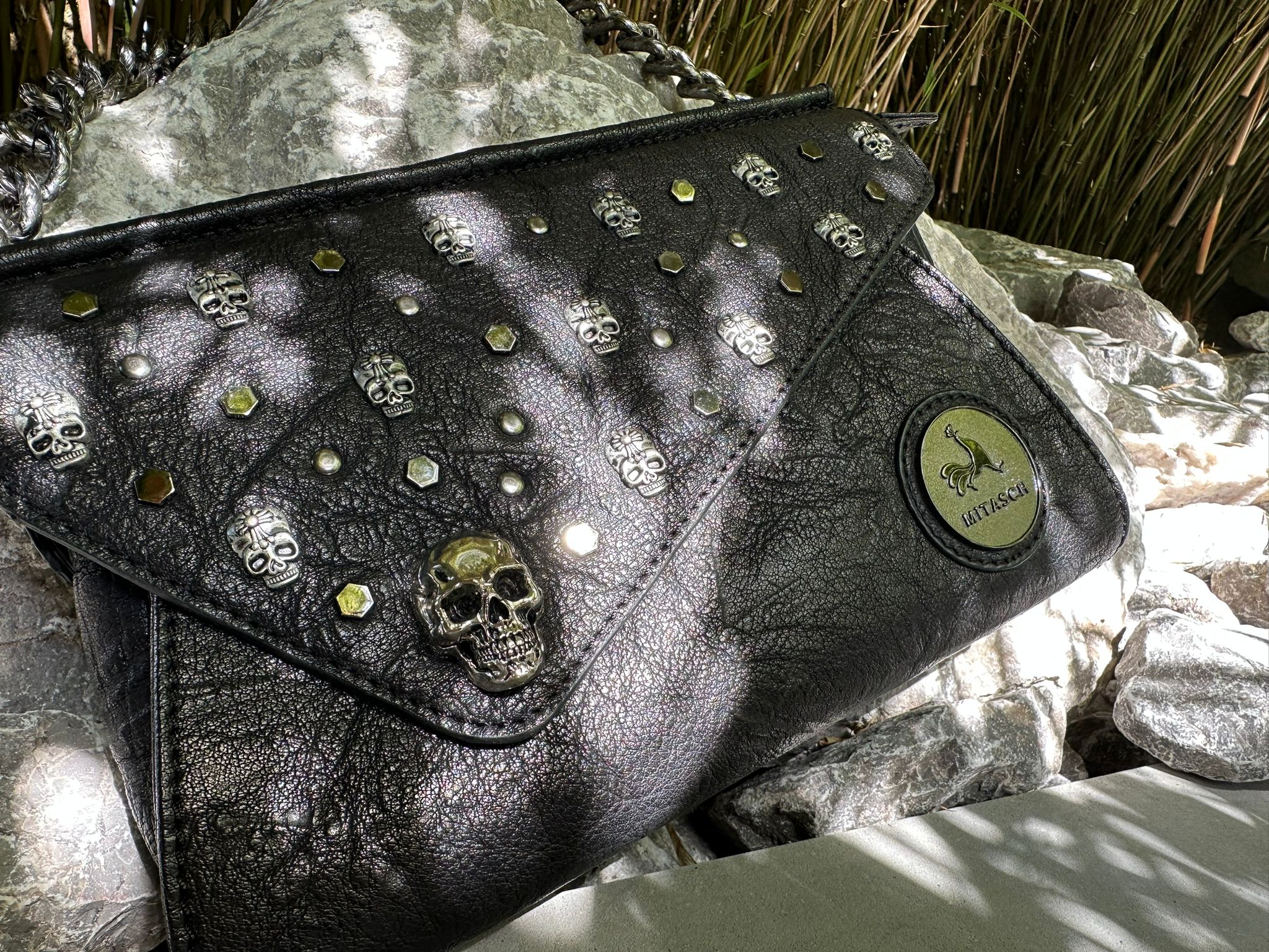 • Die Ledertasche für Damen in schwarz ist mit ihrem extravaganten Design, aber toller Funktionalität, der perfekte Begleiter im Alltag oder für besondere Anlässe. Mit den silbernen Skull-Nieten und der Kette zum Umhängen ist diese Clutch der Hingucker.