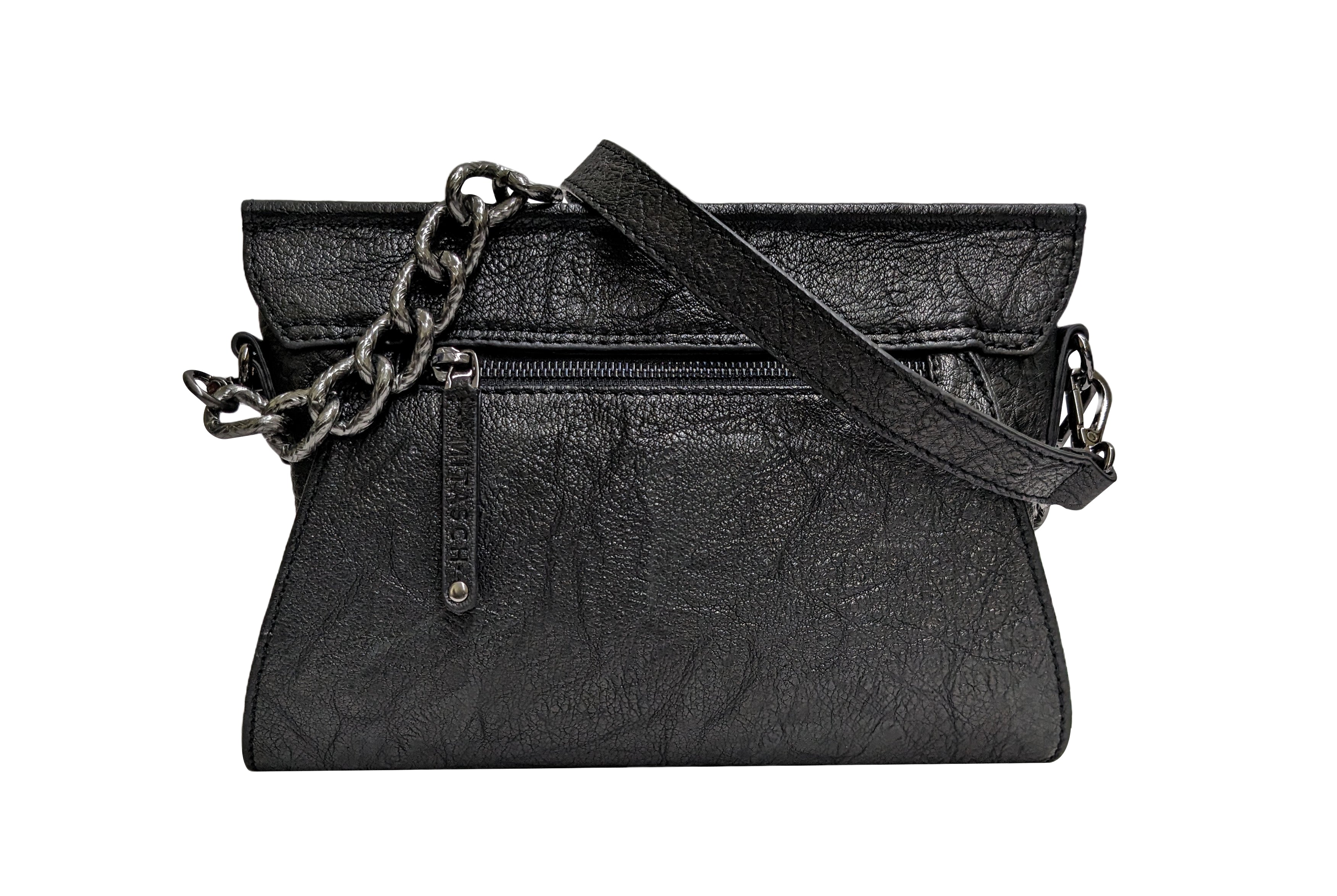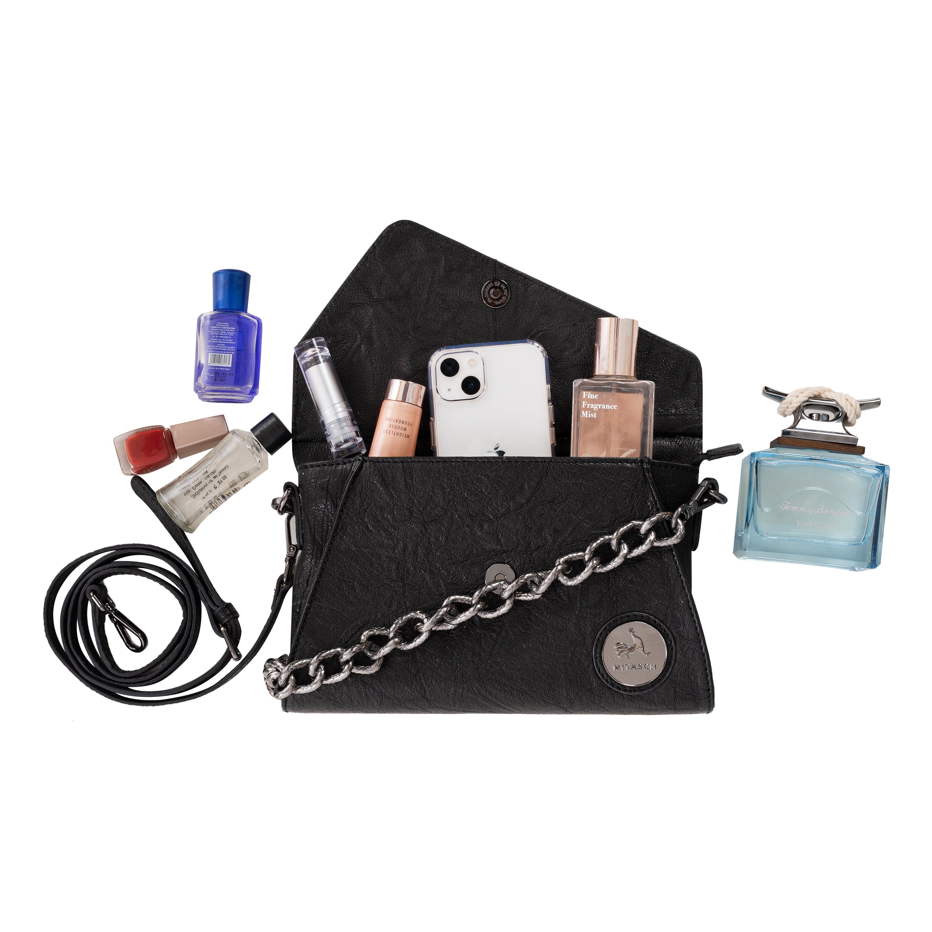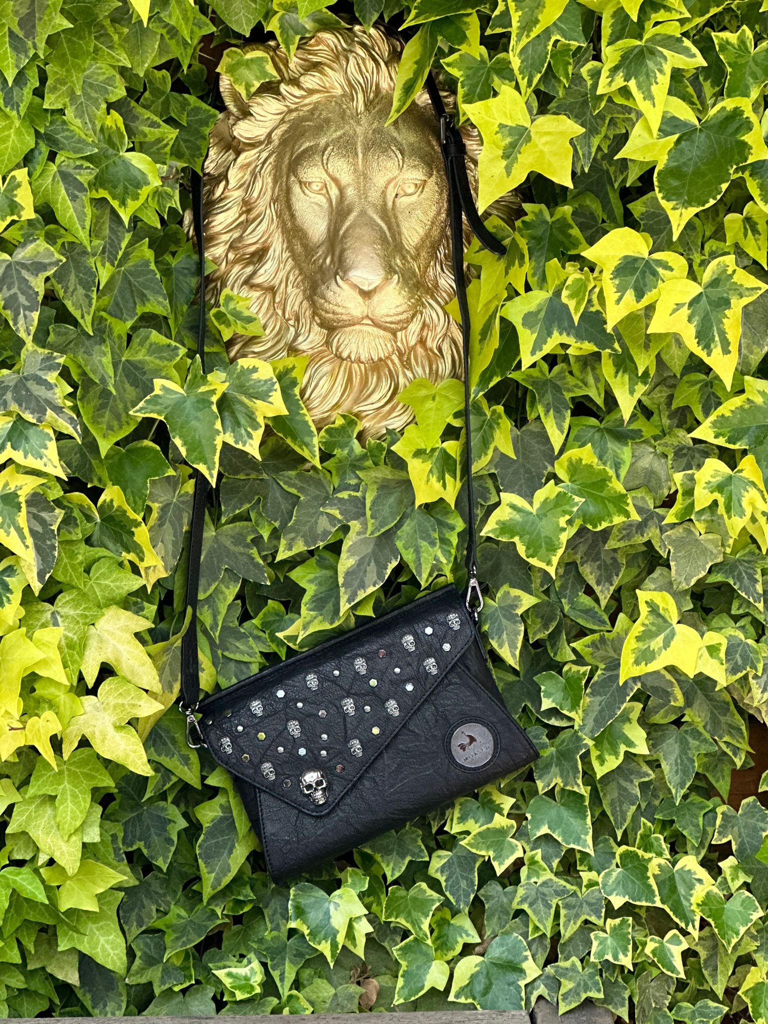 • Die Ledertasche für Damen in schwarz ist mit ihrem extravaganten Design, aber toller Funktionalität, der perfekte Begleiter im Alltag oder für besondere Anlässe. Mit den silbernen Skull-Nieten und der Kette zum Umhängen ist diese Clutch der Hingucker.