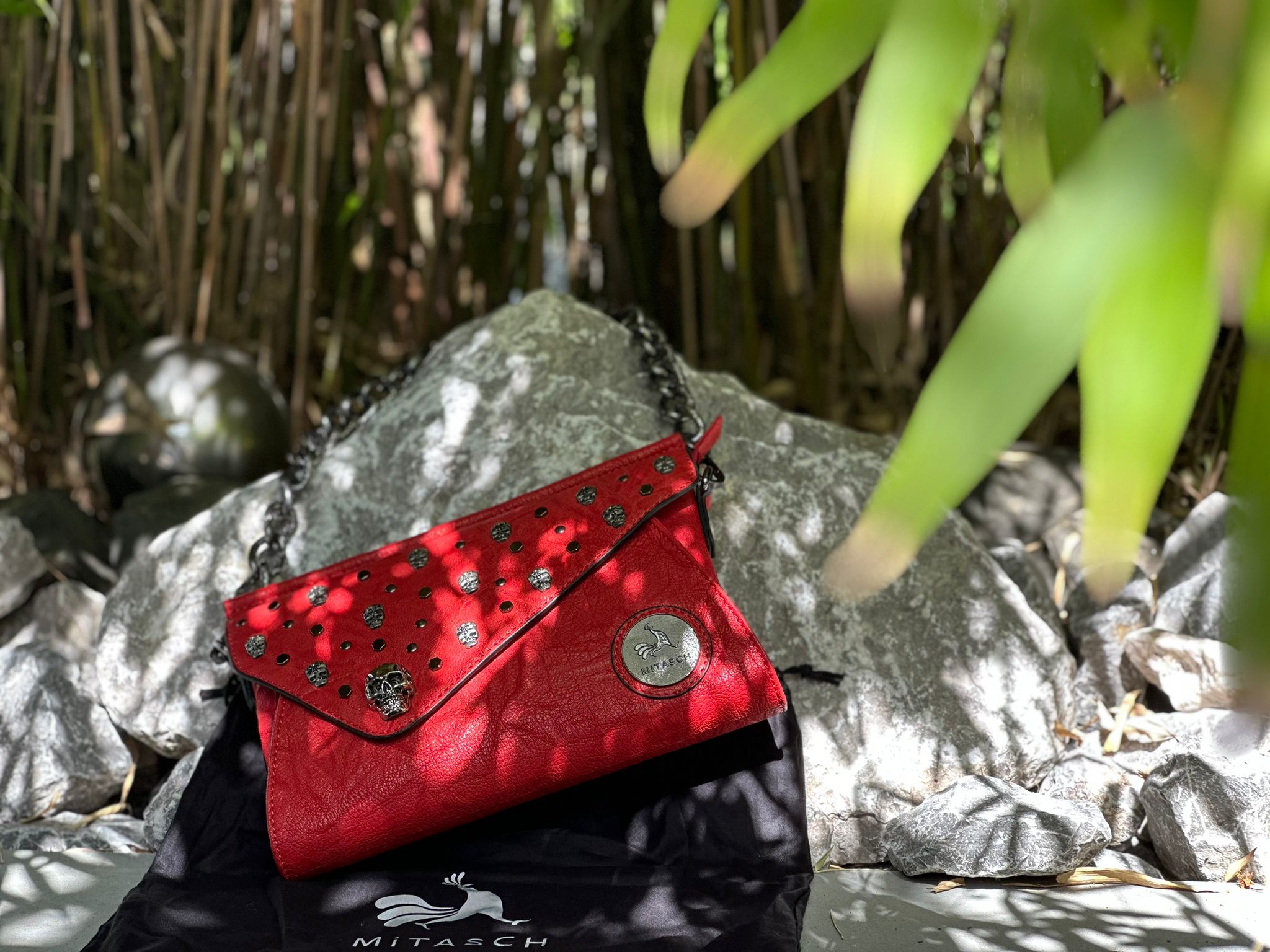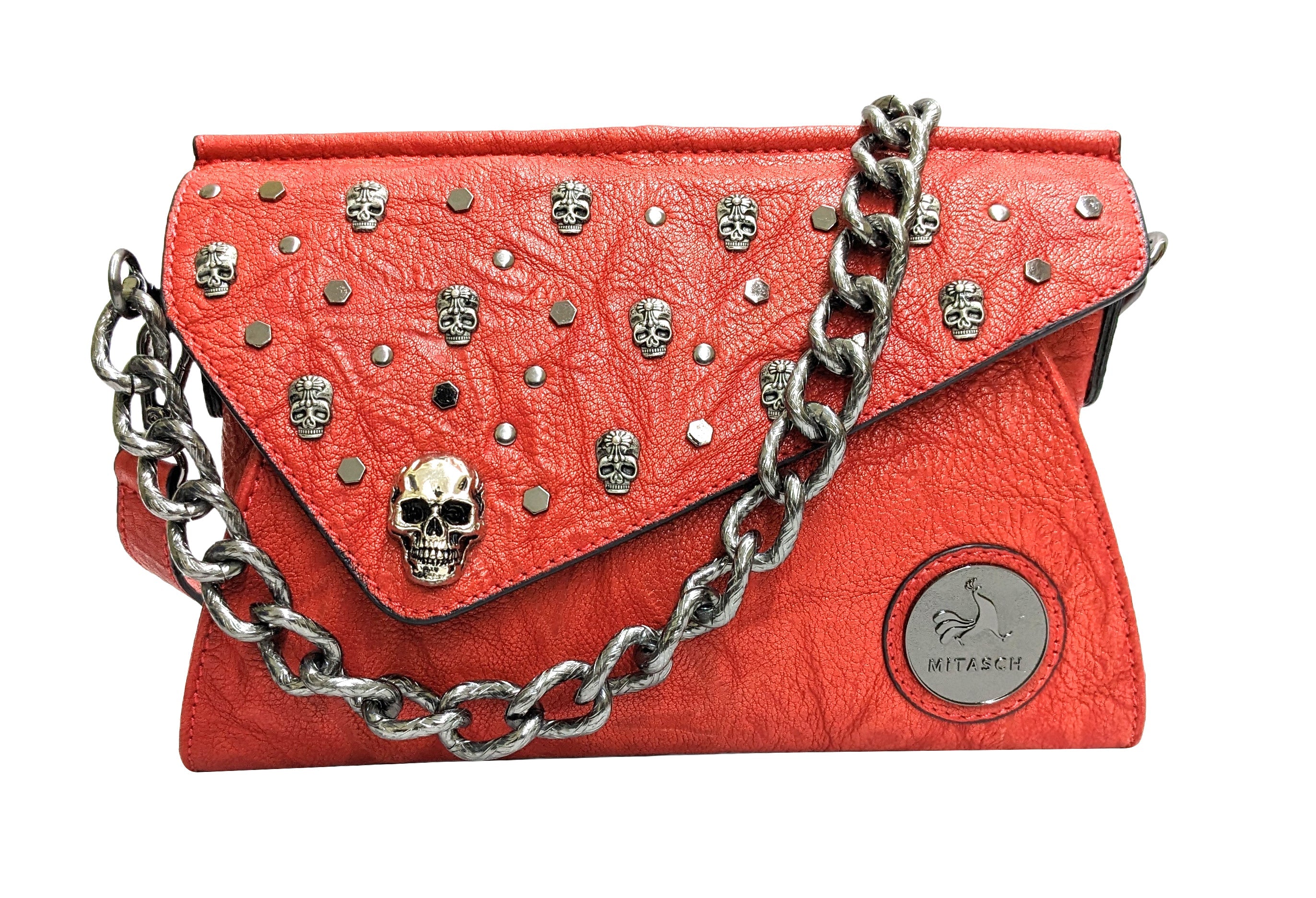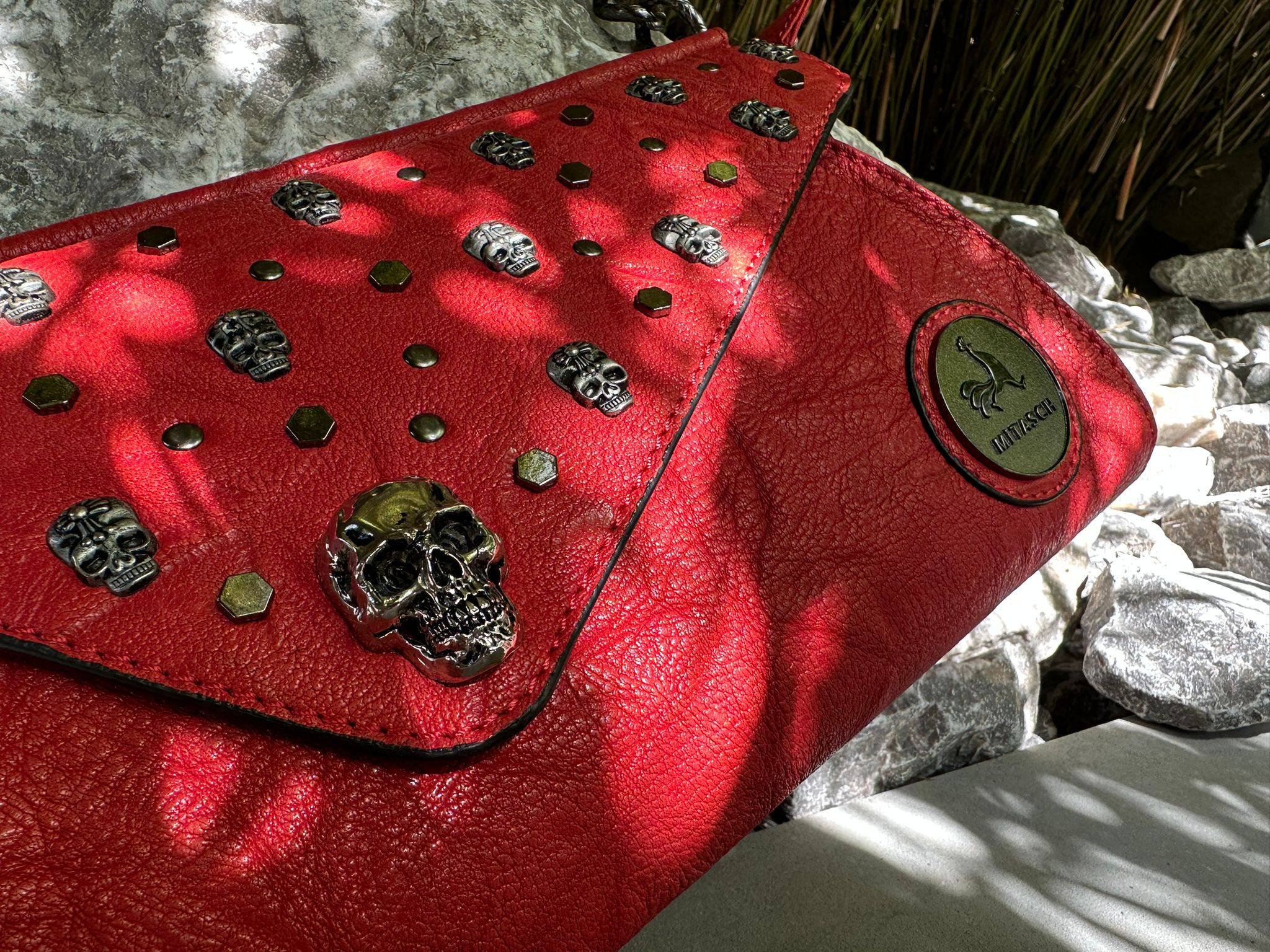 • Die Ledertasche für Damen in rot ist mit ihrem extravaganten Design, aber toller Funktionalität, der perfekte Begleiter im Alltag oder für besondere Anlässe. Mit den silbernen Skull-Nieten und der Kette zum Umhängen ist diese Clutch der Hingucker.