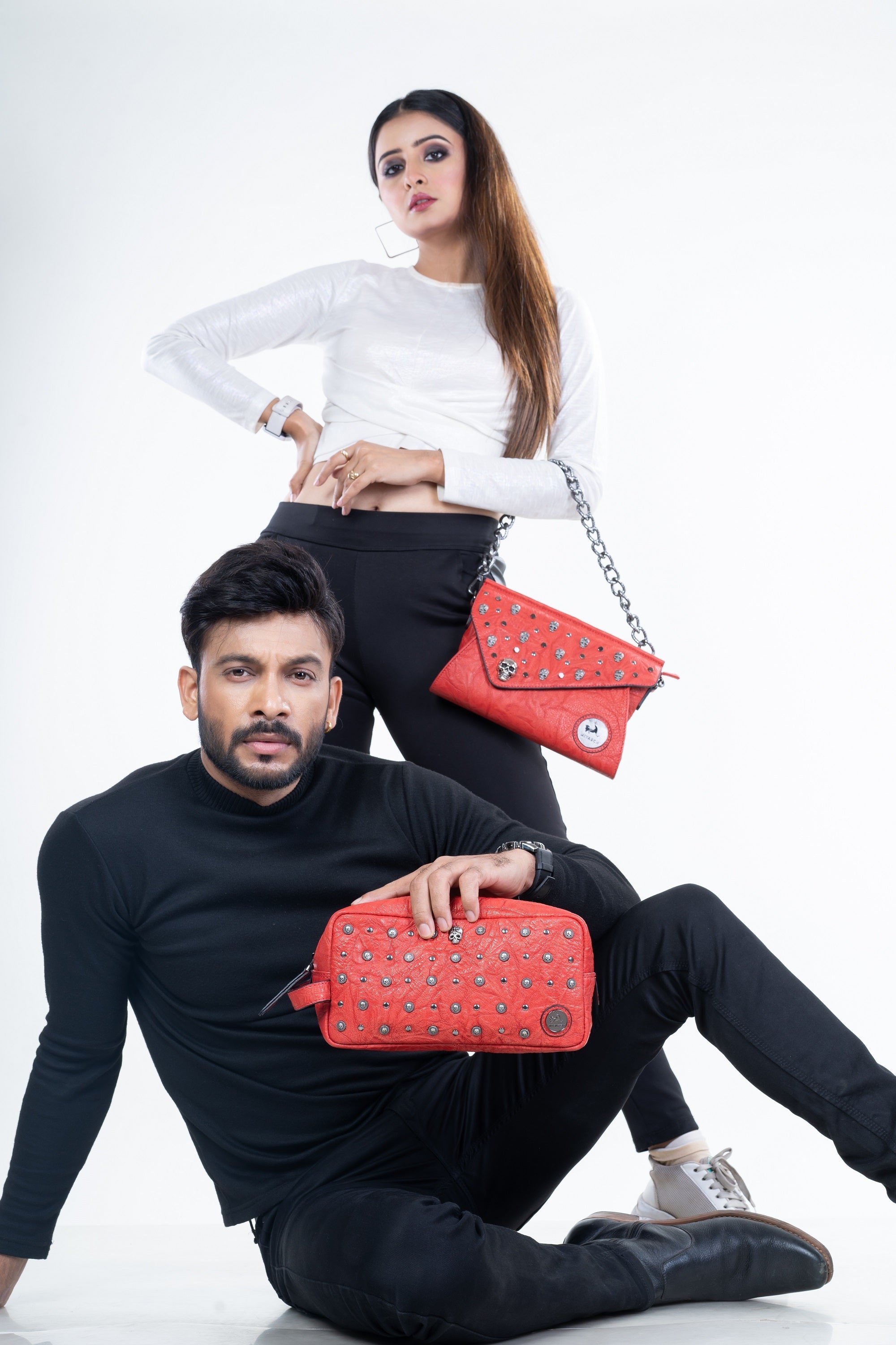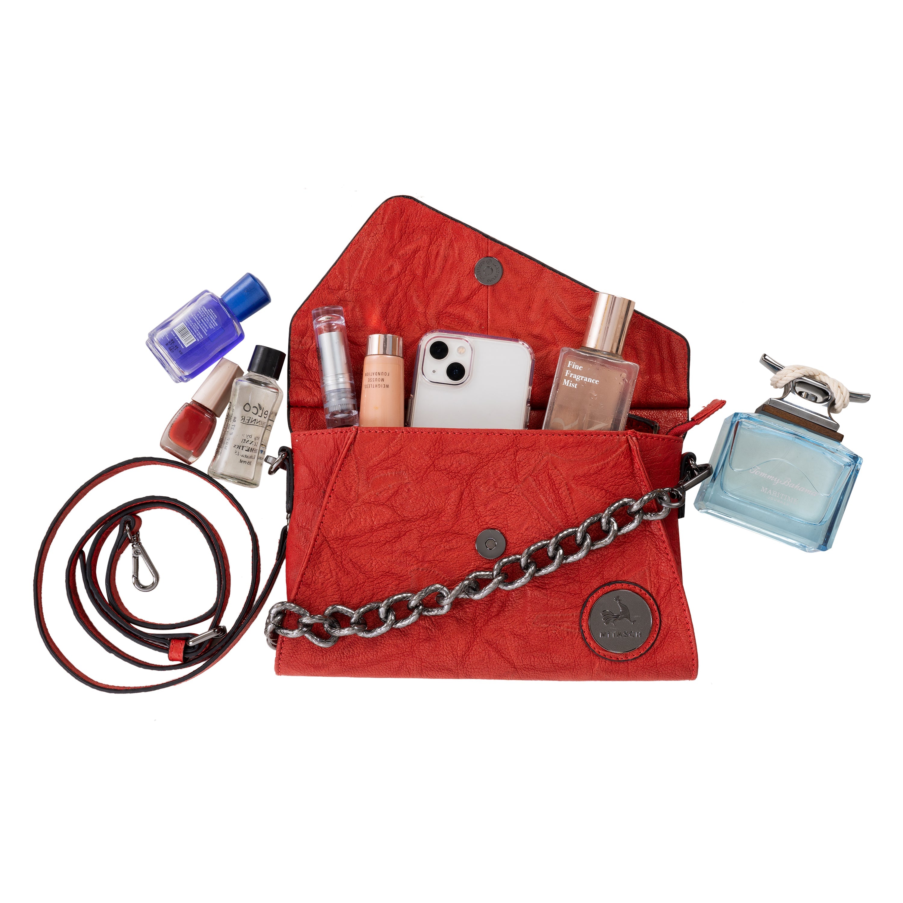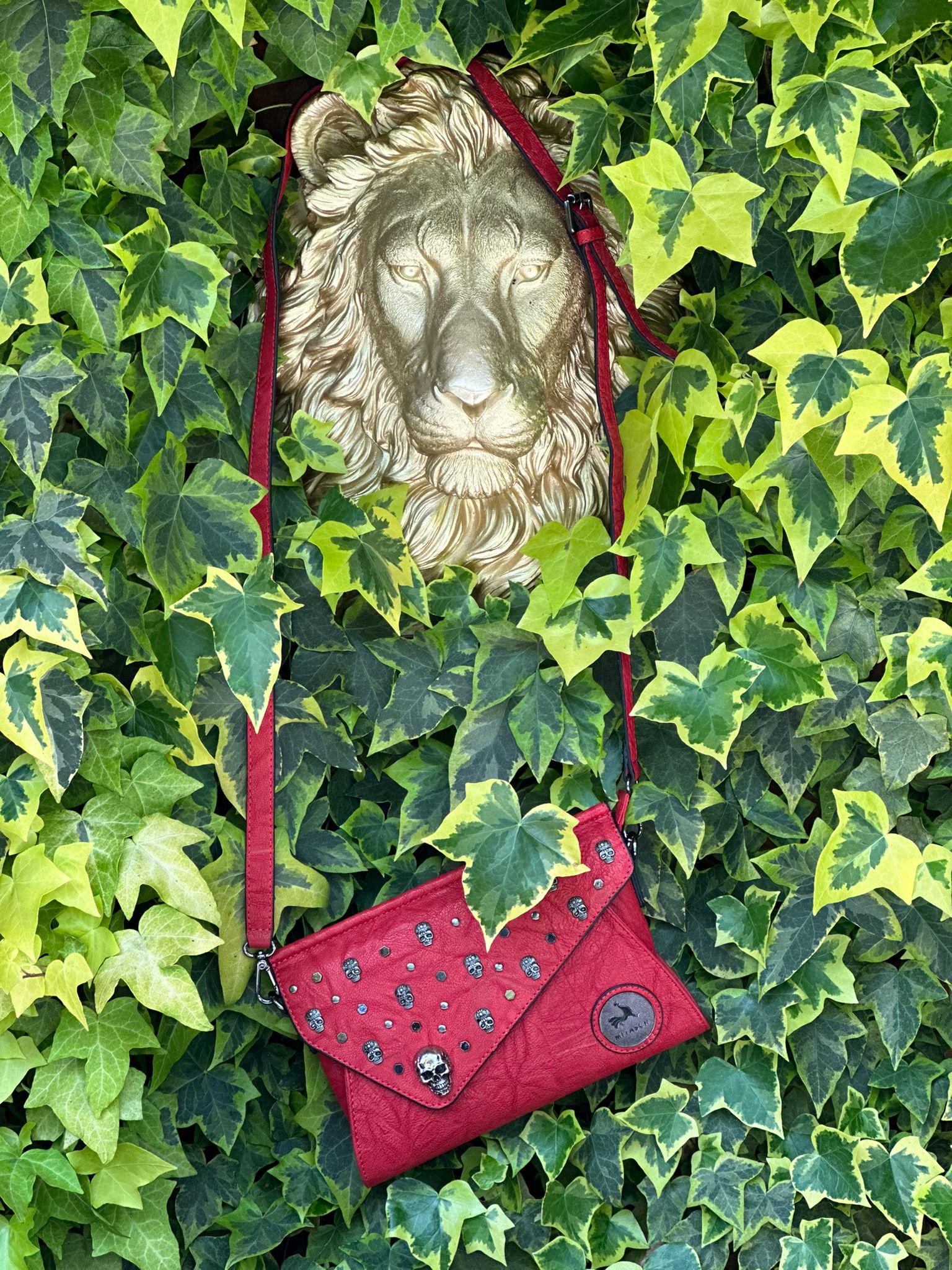 • Die Ledertasche für Damen in rot ist mit ihrem extravaganten Design, aber toller Funktionalität, der perfekte Begleiter im Alltag oder für besondere Anlässe. Mit den silbernen Skull-Nieten und der Kette zum Umhängen ist diese Clutch der Hingucker.