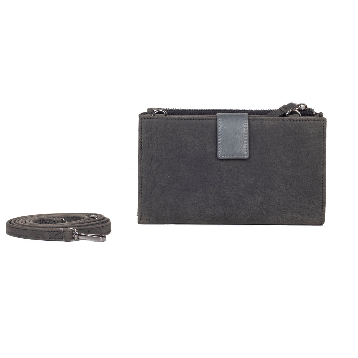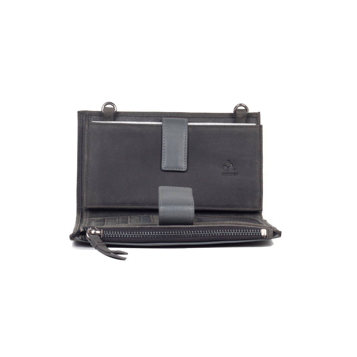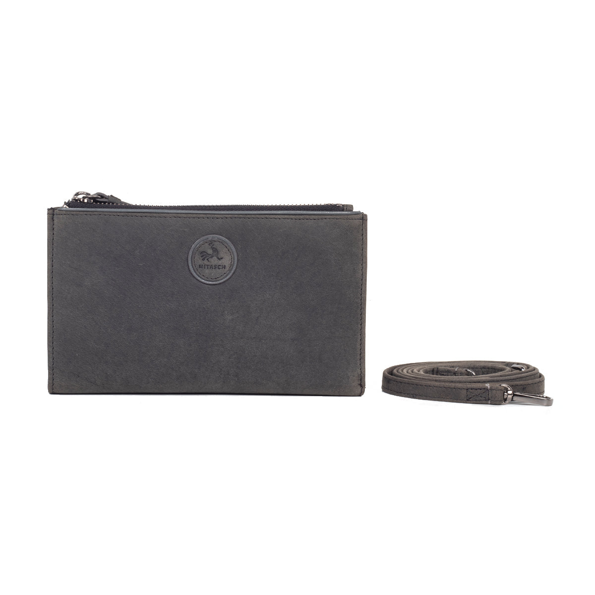 • Geldbörse, Umhängetasche, Schultertasch, Clutch inkl. einem Handyfach, alles kombiniert in einer Tasche aus feinstem Leder. In schönem Schwarz mit Grauem Kick.