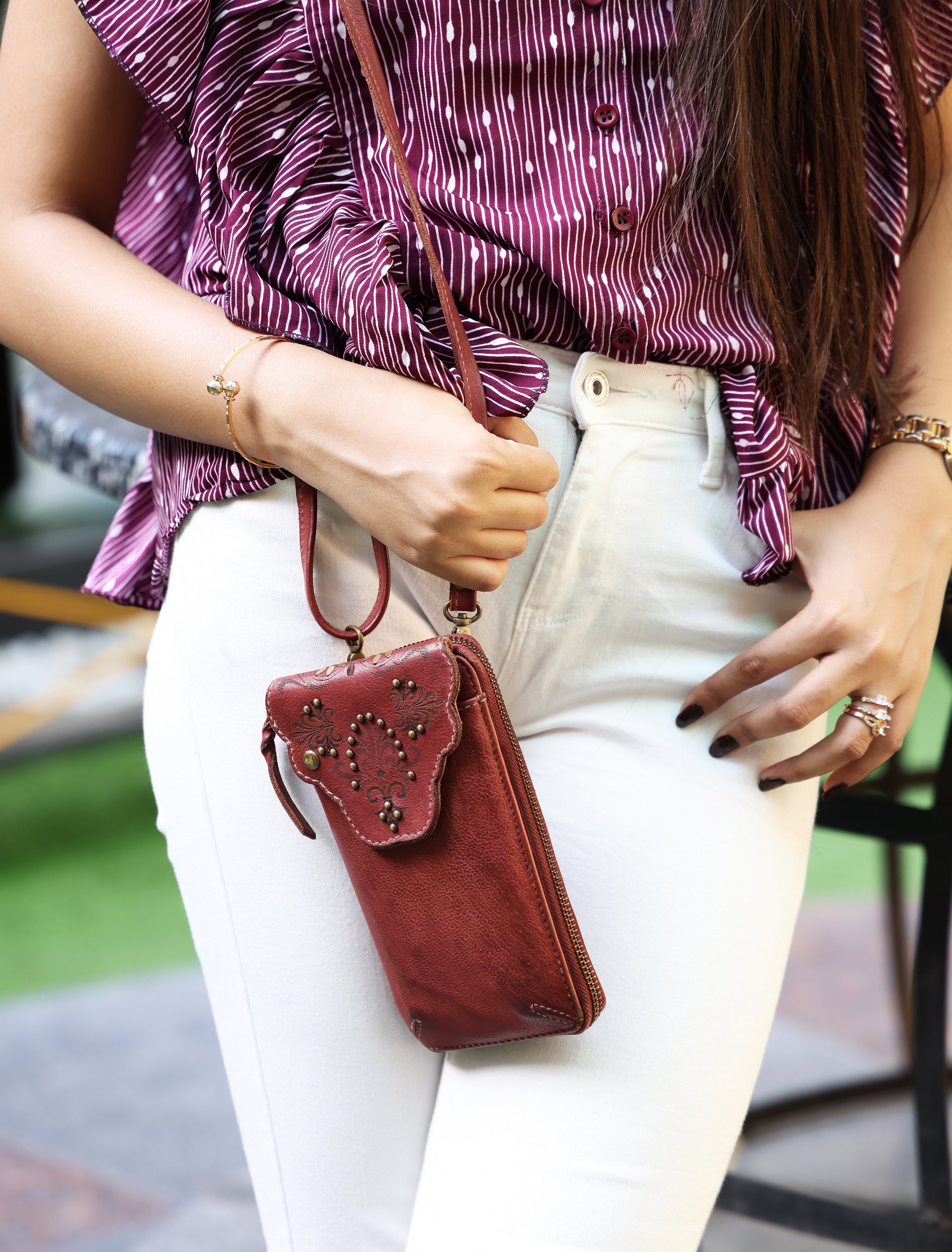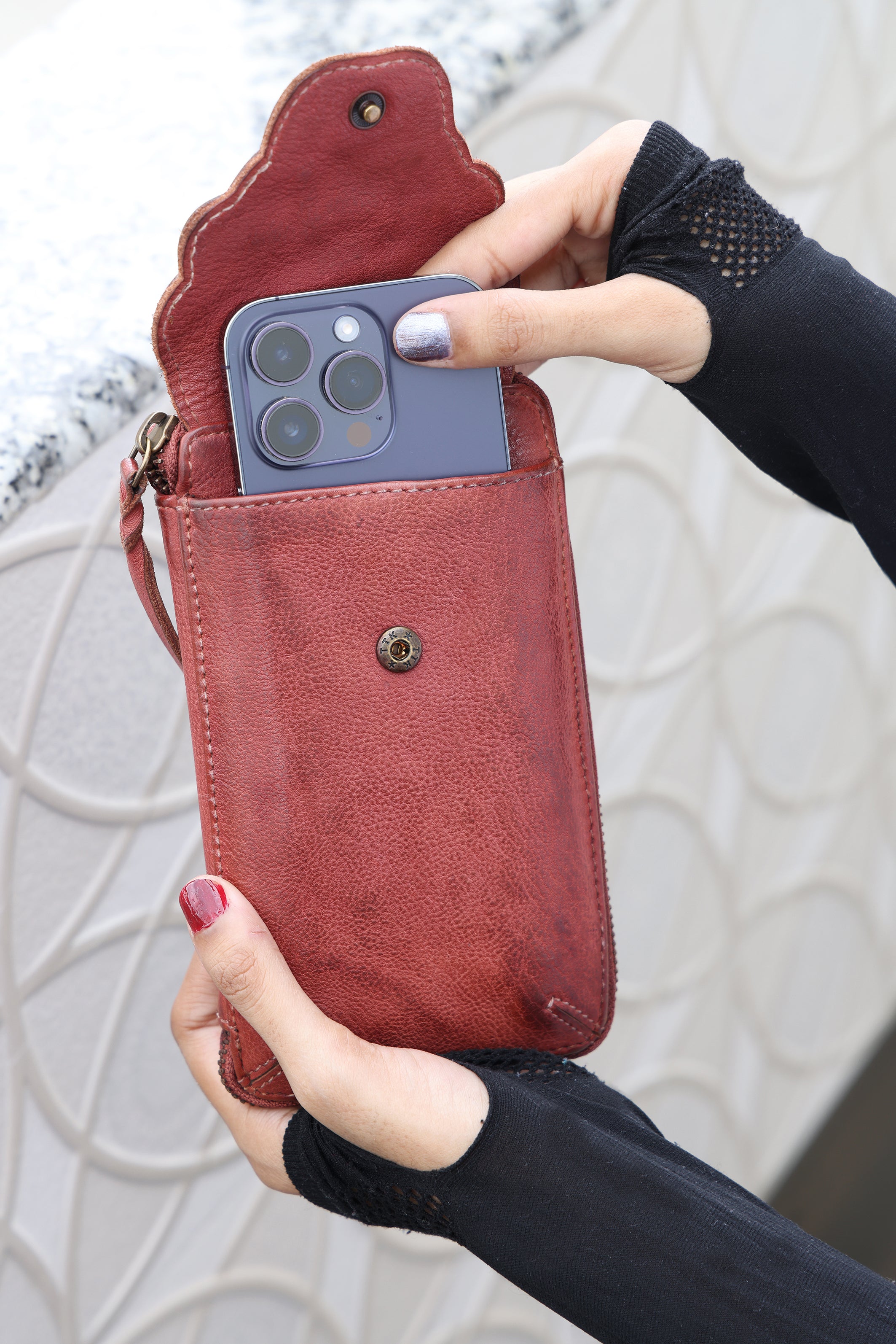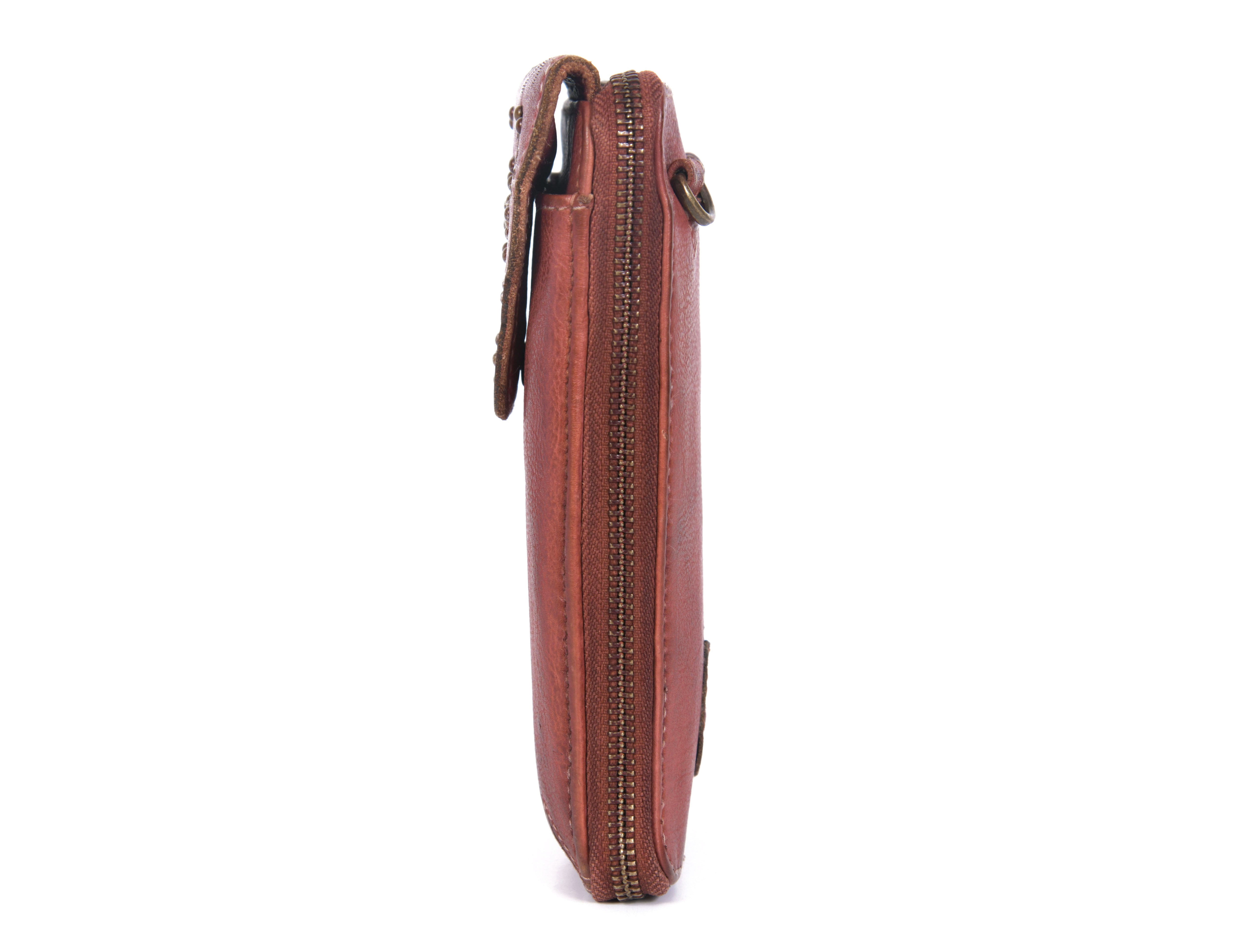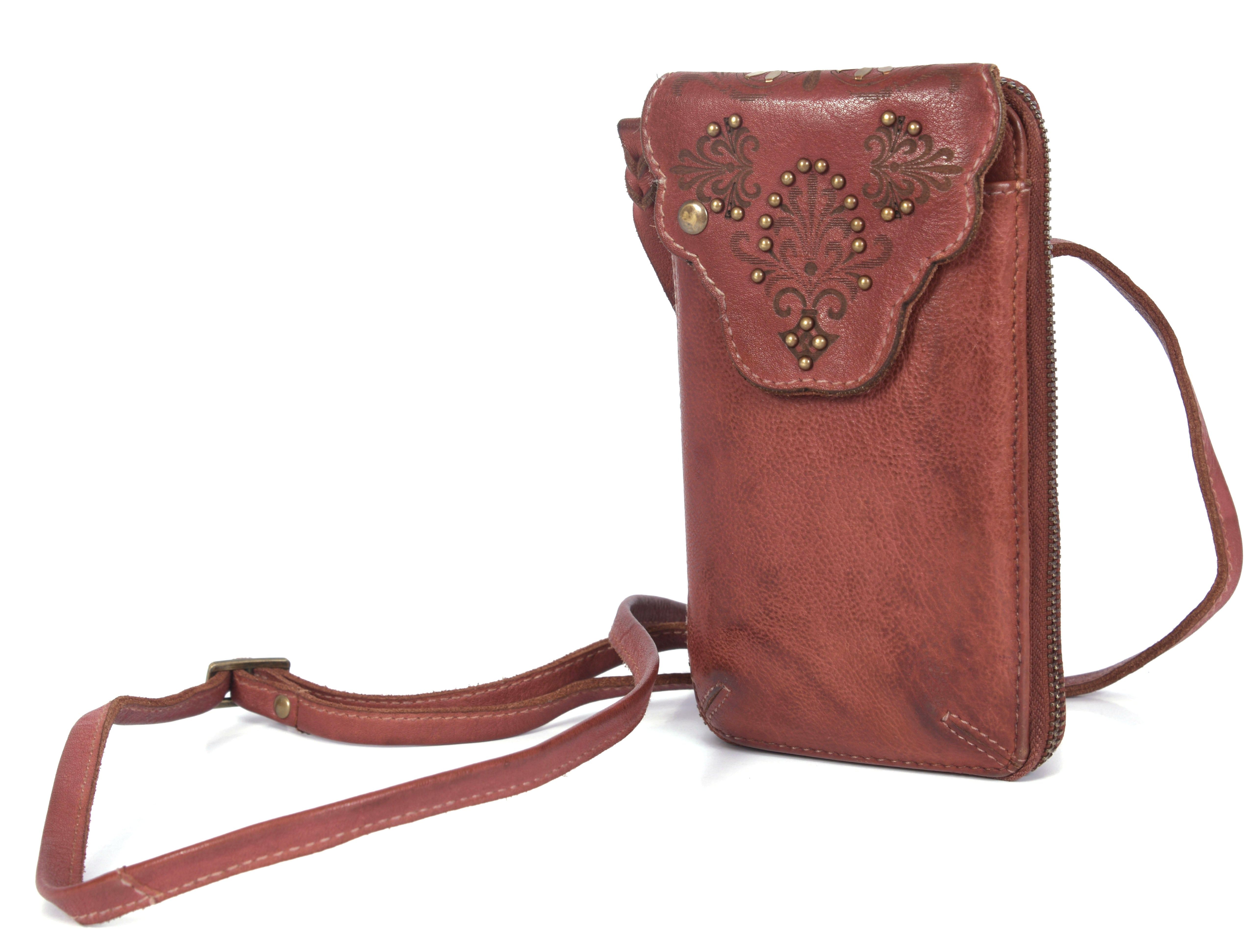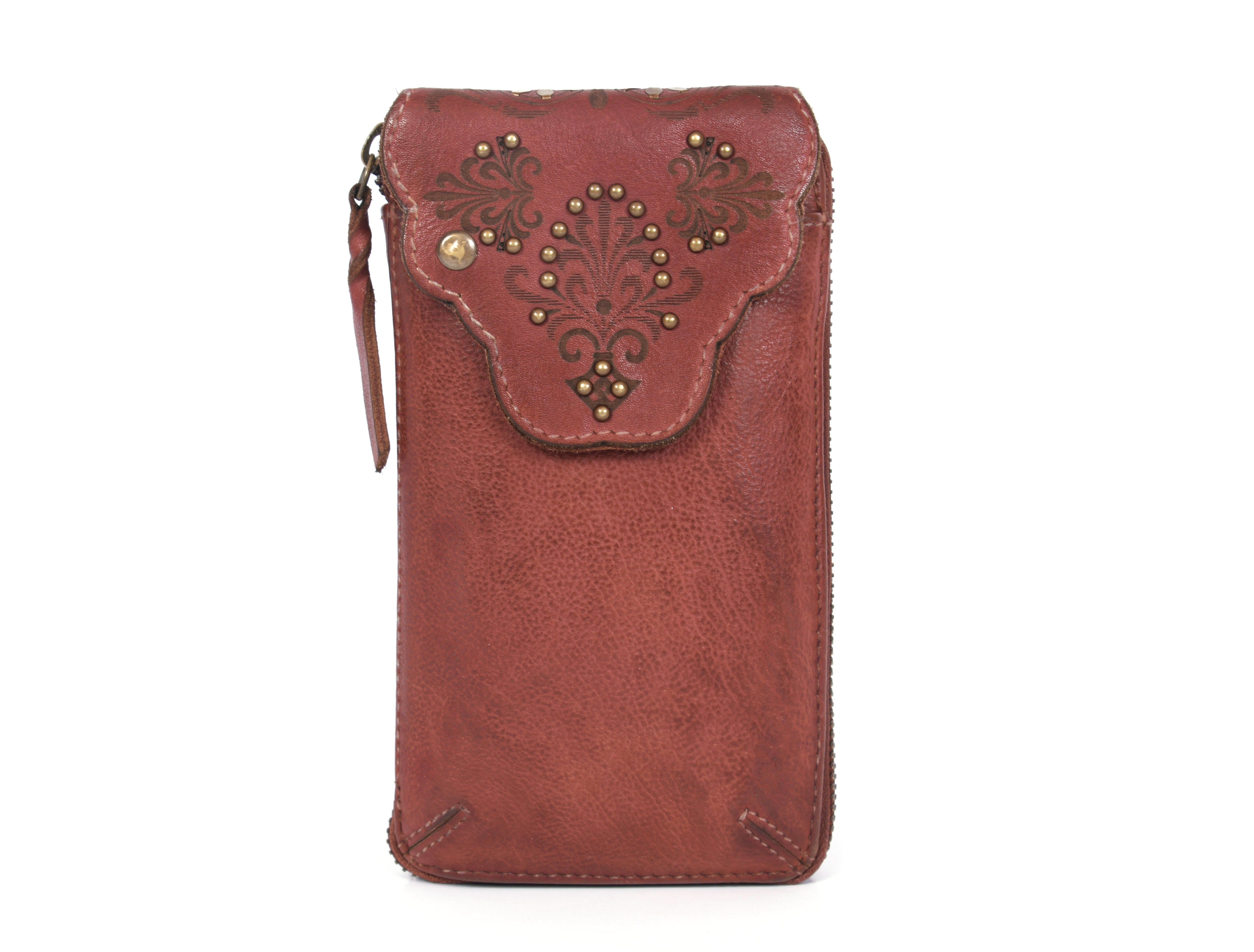 • EINZIGARTIG - Unsere Handytasche Elise ist mit ihrem einzigartigen Design ein echter Hingucker. Die Tasche in dunkelroter Farbe sticht mit ihrem einzigartigem Design und ihren Nieten besonders heraus.