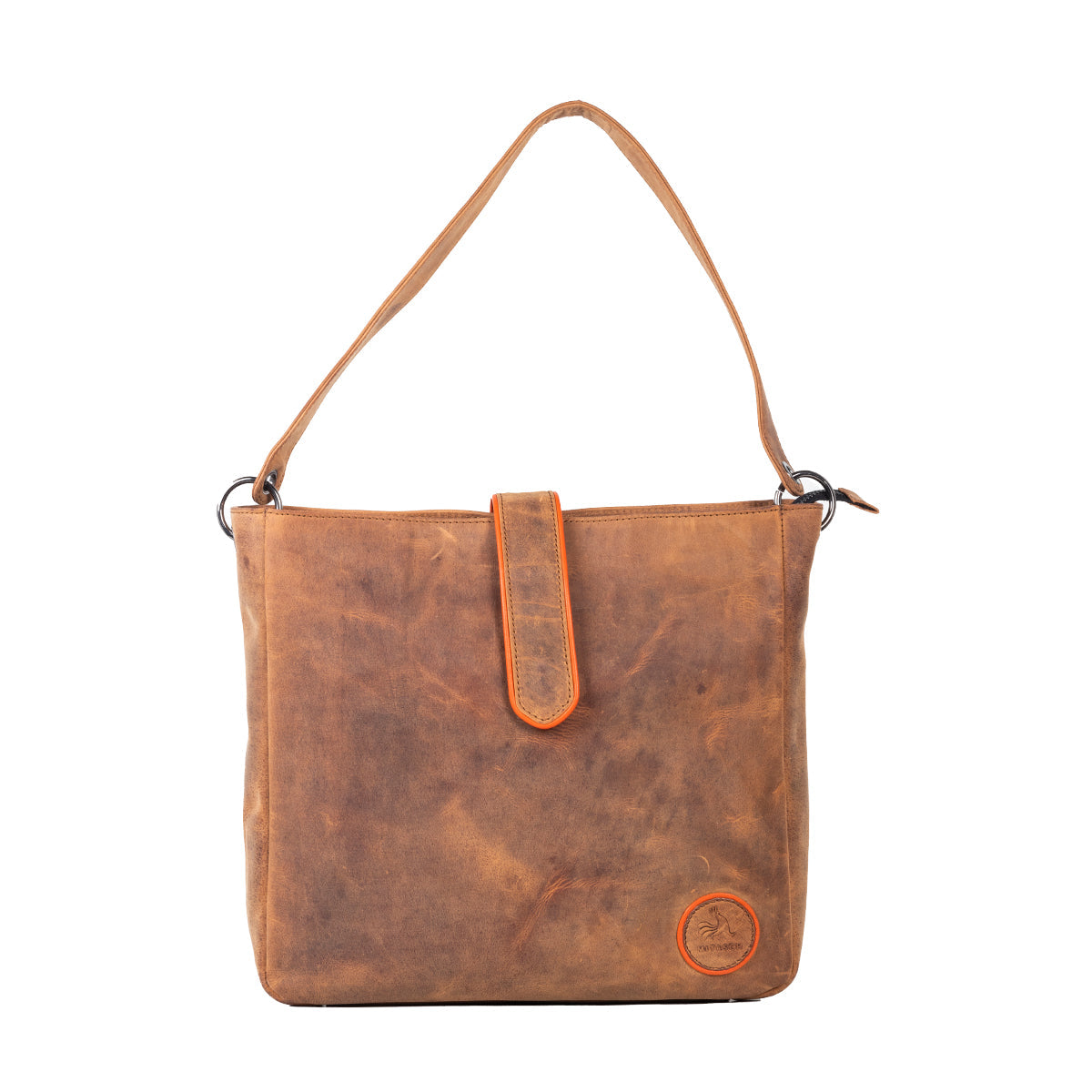 • Die Ledertasche Damen in Braun mit Orange-Kick ist mit ihrem schlichten Design der perfekte Begleiter für einen kleinen Stadtbummel oder einen eleganten Abend. Unser Shopper bietet genügend Platz und wird deine neue Lieblings-Lederhandtasche!