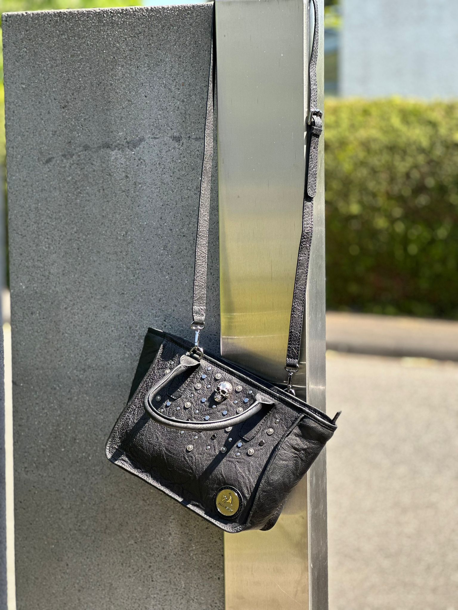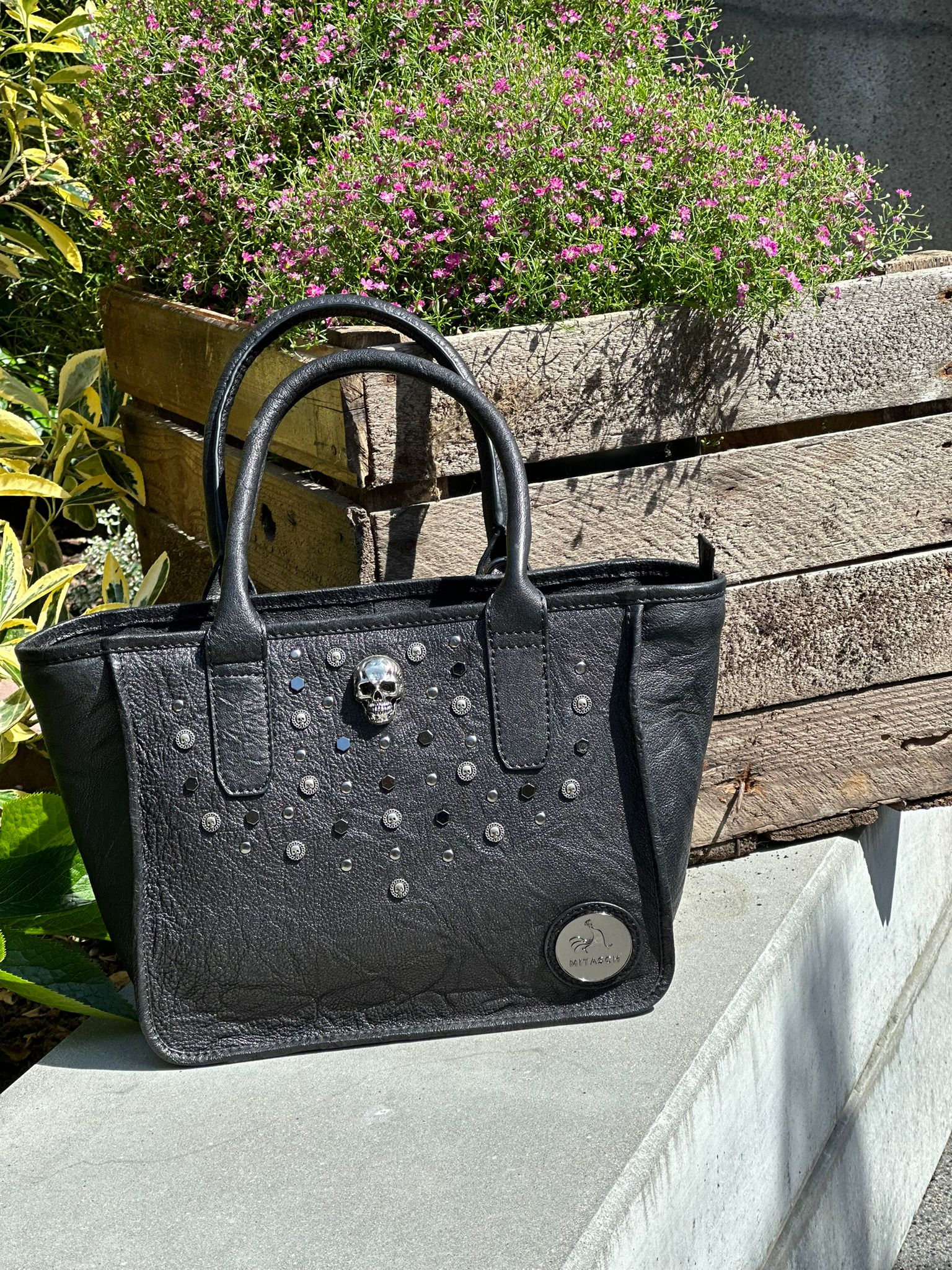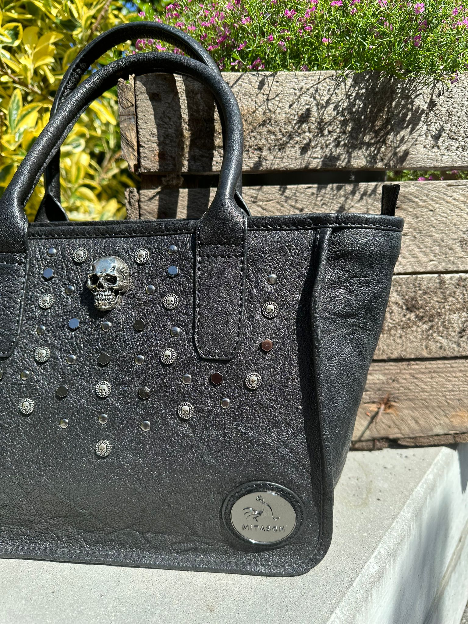 • Die Ledertasche für Damen in schwarz ist mit ihrem extravaganten Design, aber toller Funktionalität, der perfekte Begleiter im Alltag oder für besondere Anlässe. Mit den silbernen Skull-Nieten ist diese Tasche der Hingucker.