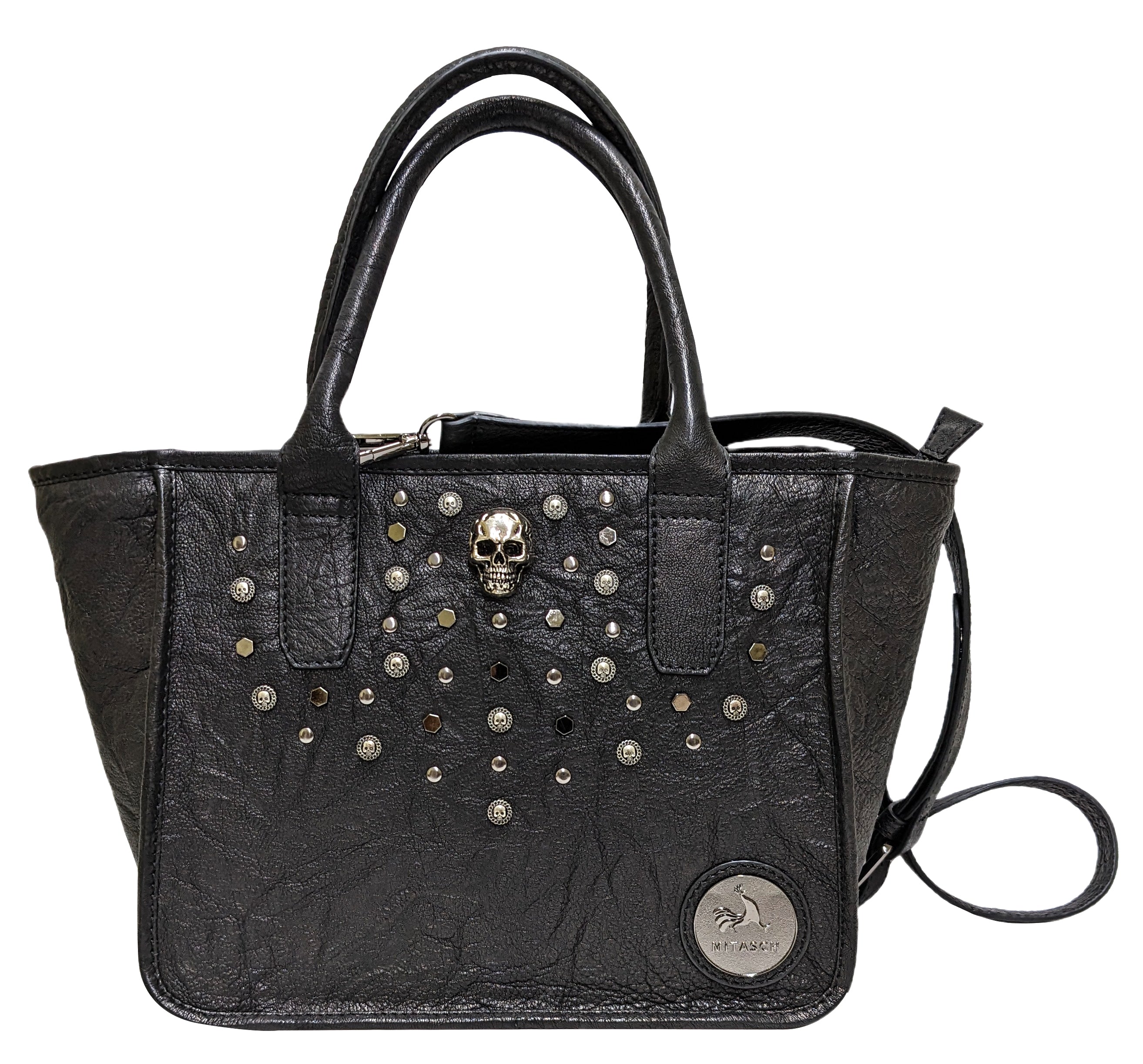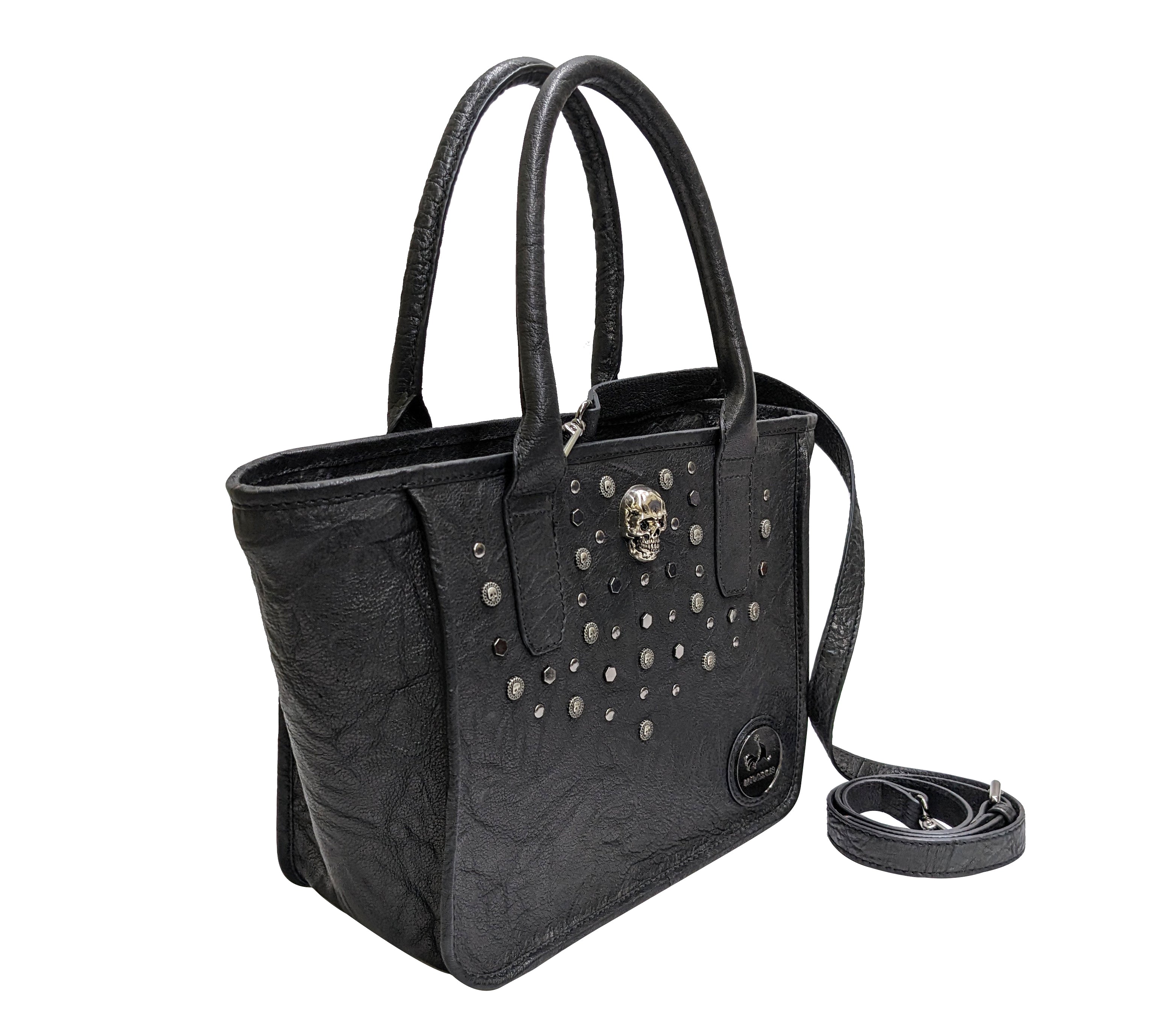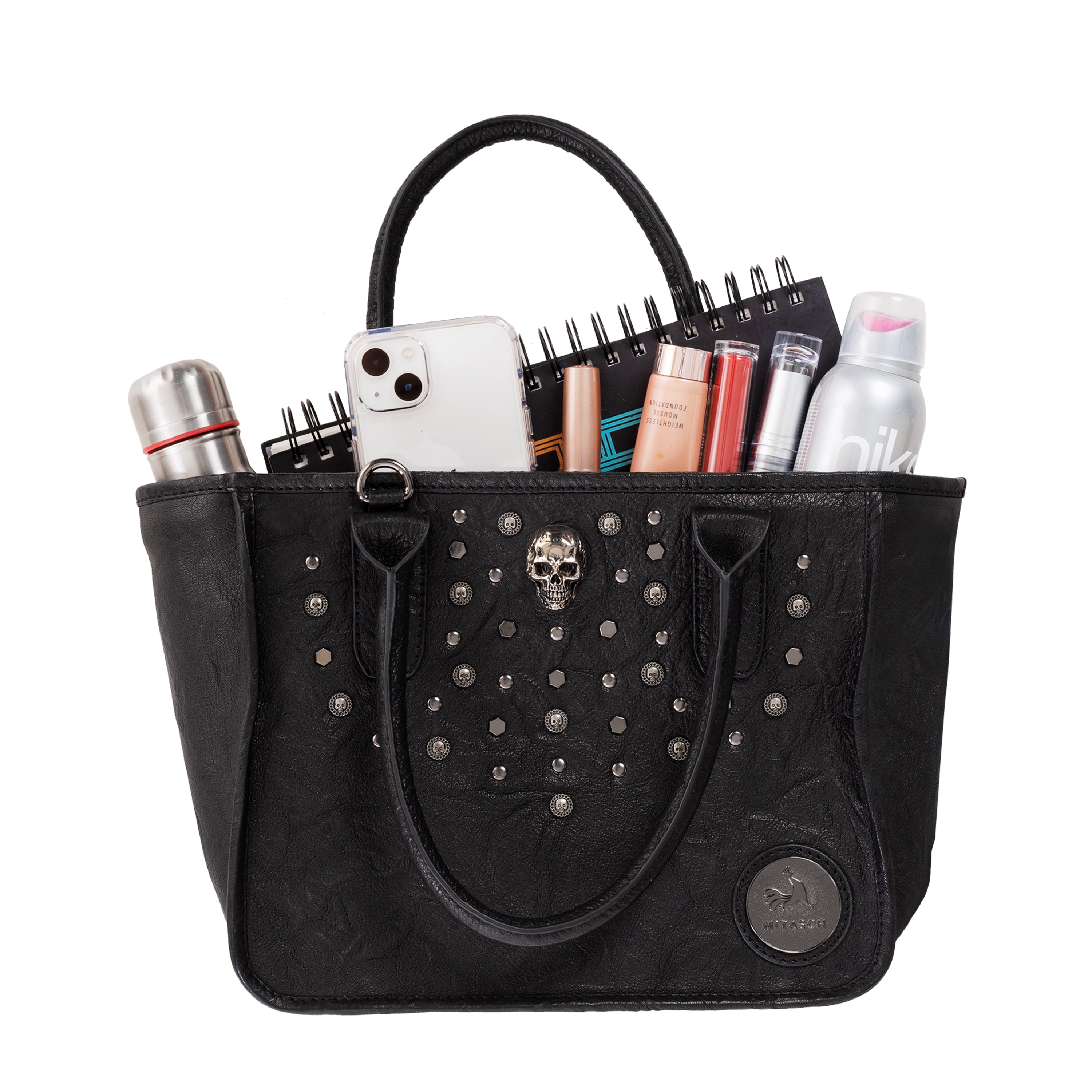 • Die Ledertasche für Damen in schwarz ist mit ihrem extravaganten Design, aber toller Funktionalität, der perfekte Begleiter im Alltag oder für besondere Anlässe. Mit den silbernen Skull-Nieten ist diese Tasche der Hingucker.