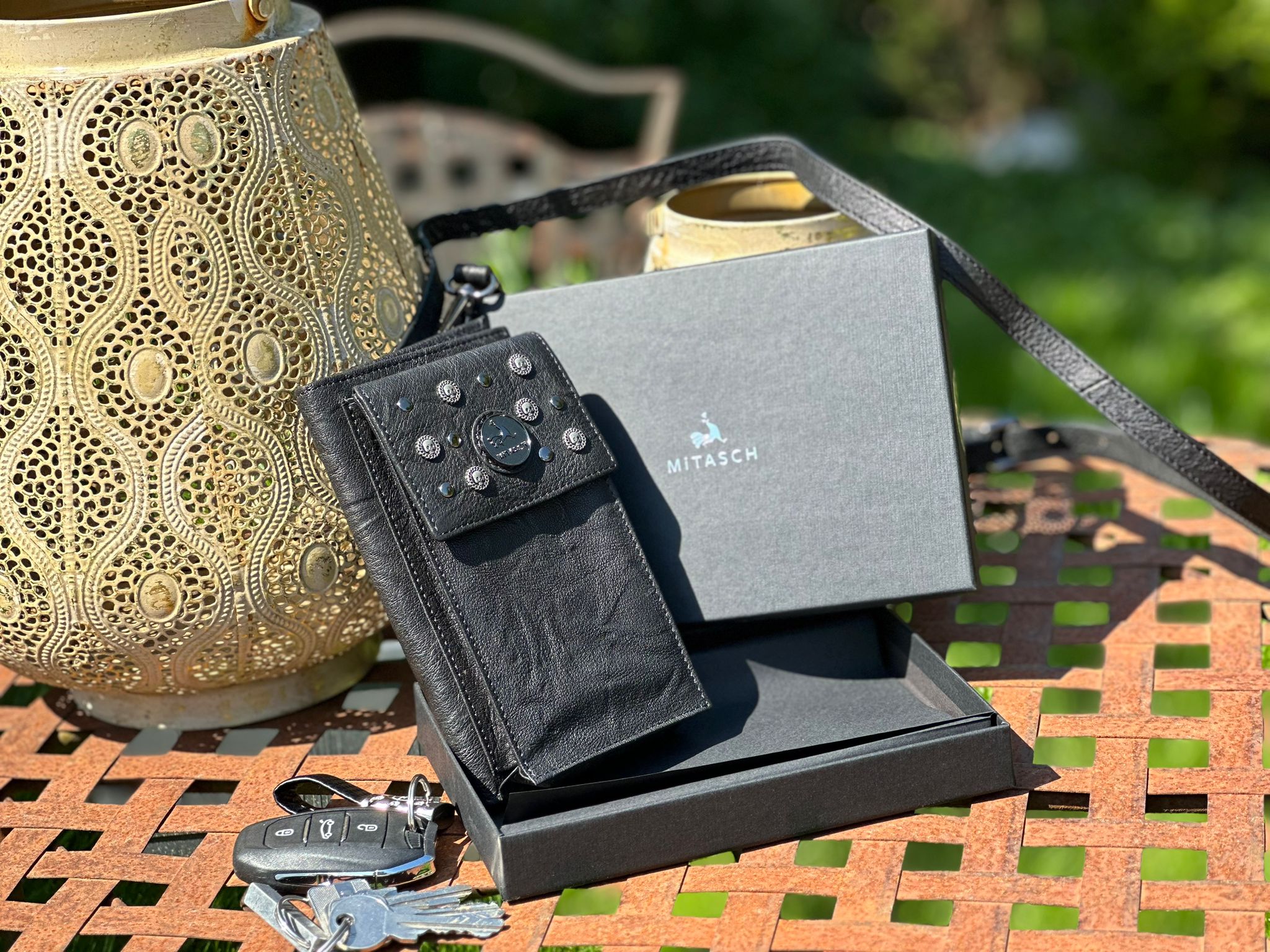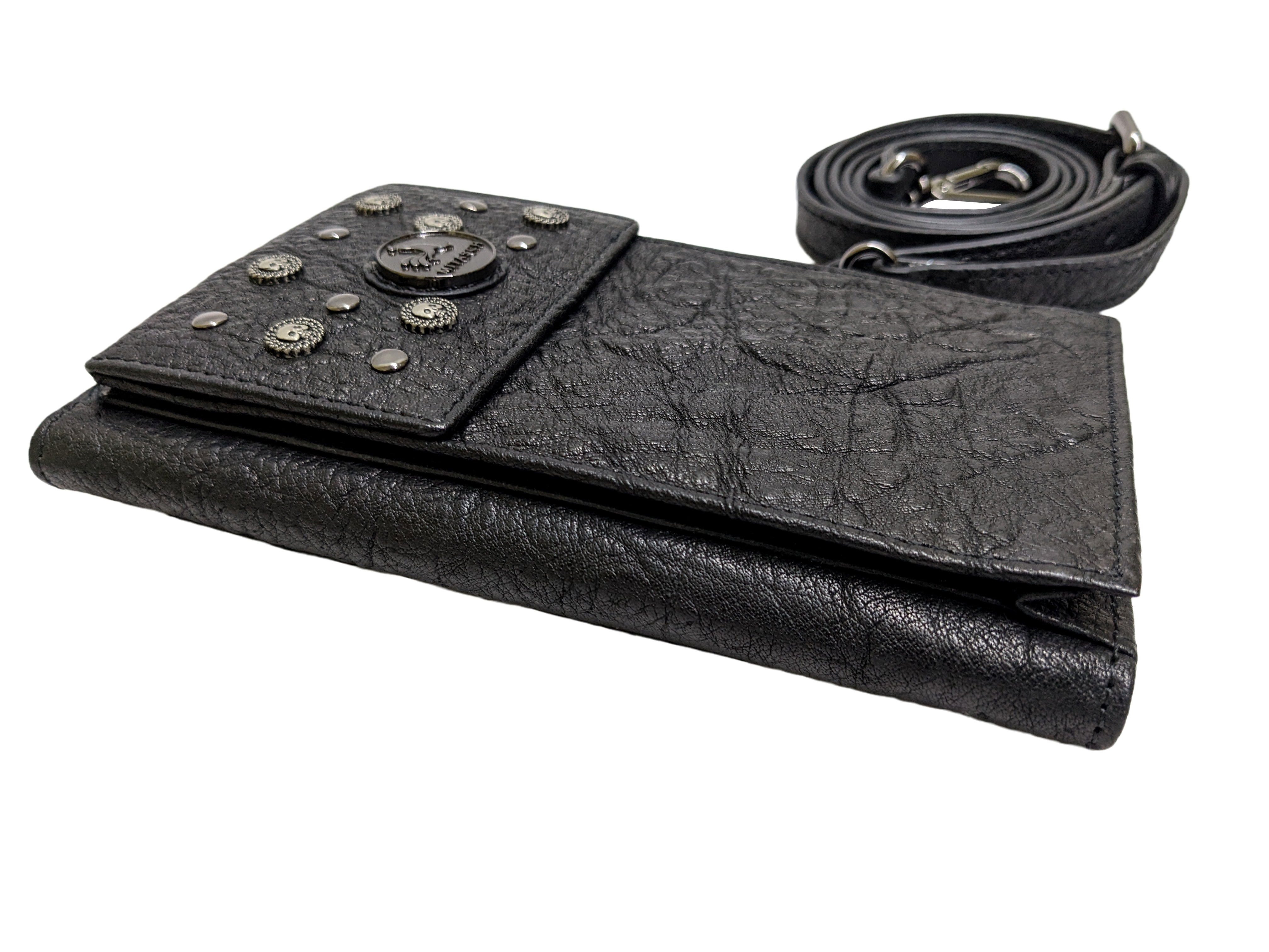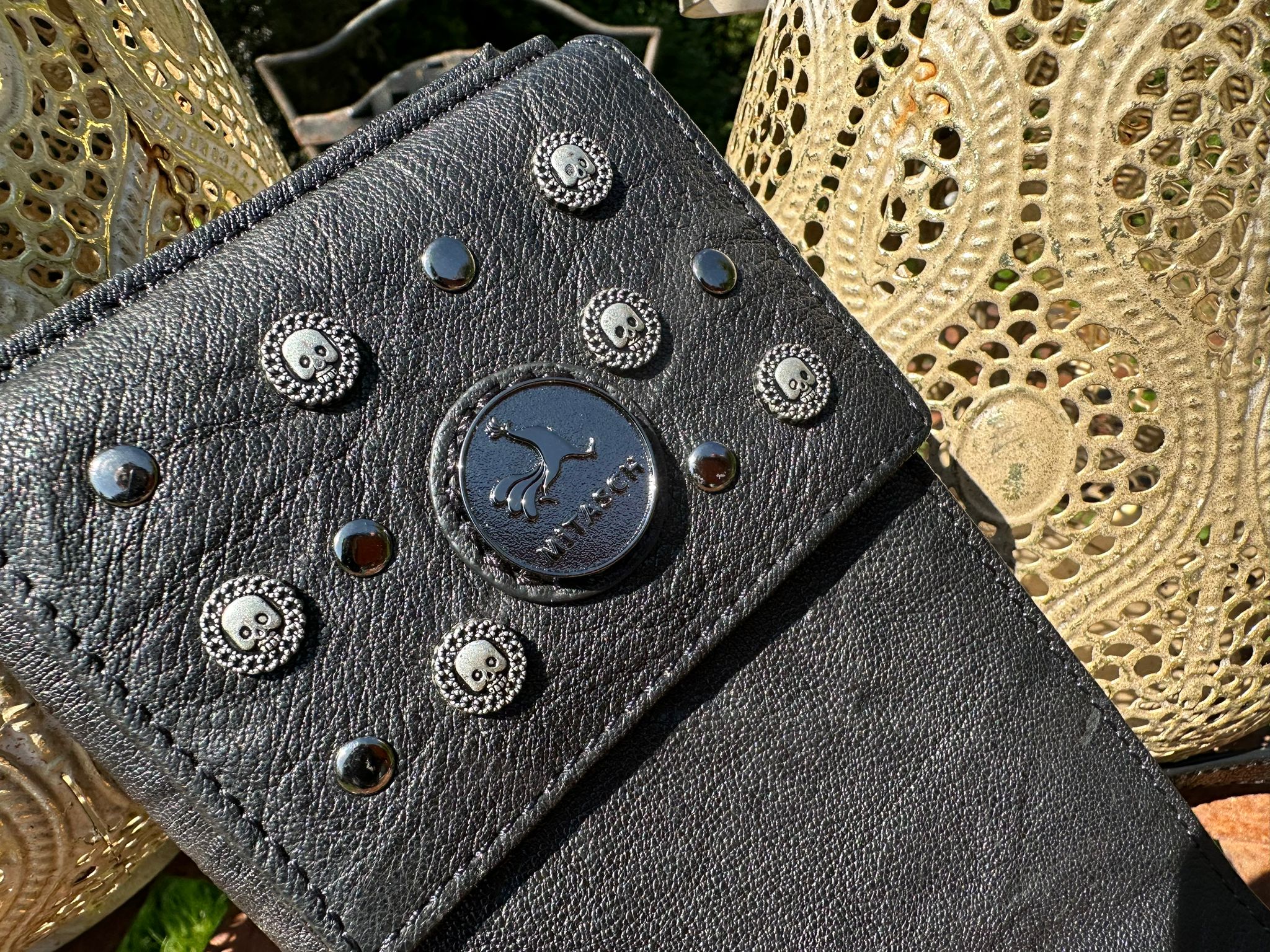 • Umhängetasche aus echtem Leder mit Handyfach. In schwarz mit einzigartigen Totenkopf-Nieten ist diese Handytasche der Hingucker und für den Alltag, aber auch für besondere Anlässe gut geeignet.