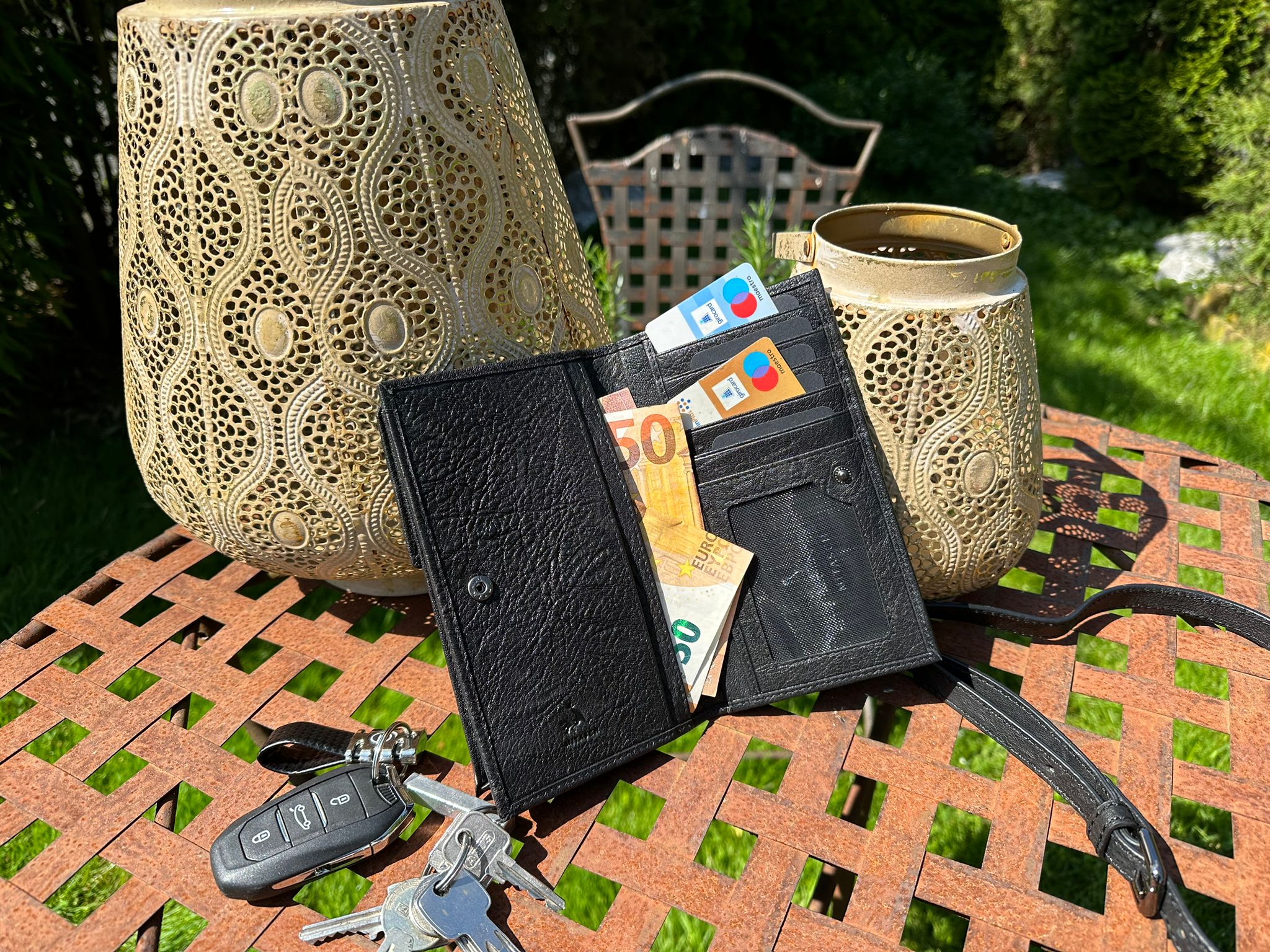 • Die Tasche ist ausgestattet mit Kartenfächern (RFID-geschützt), einem Scheinfach und einem Fach für deinen Personalausweis. Zuzüglich einem Schultergurt / Crossbodygurt.