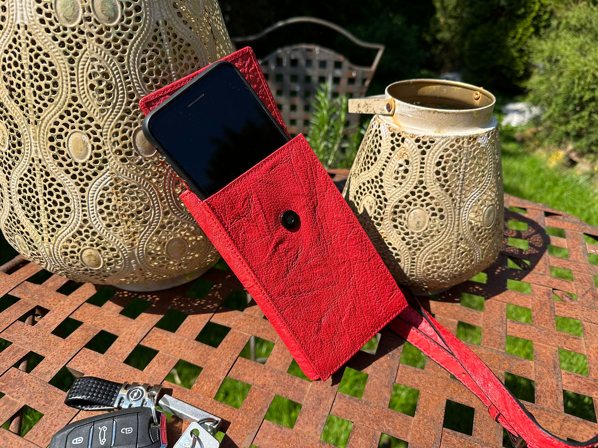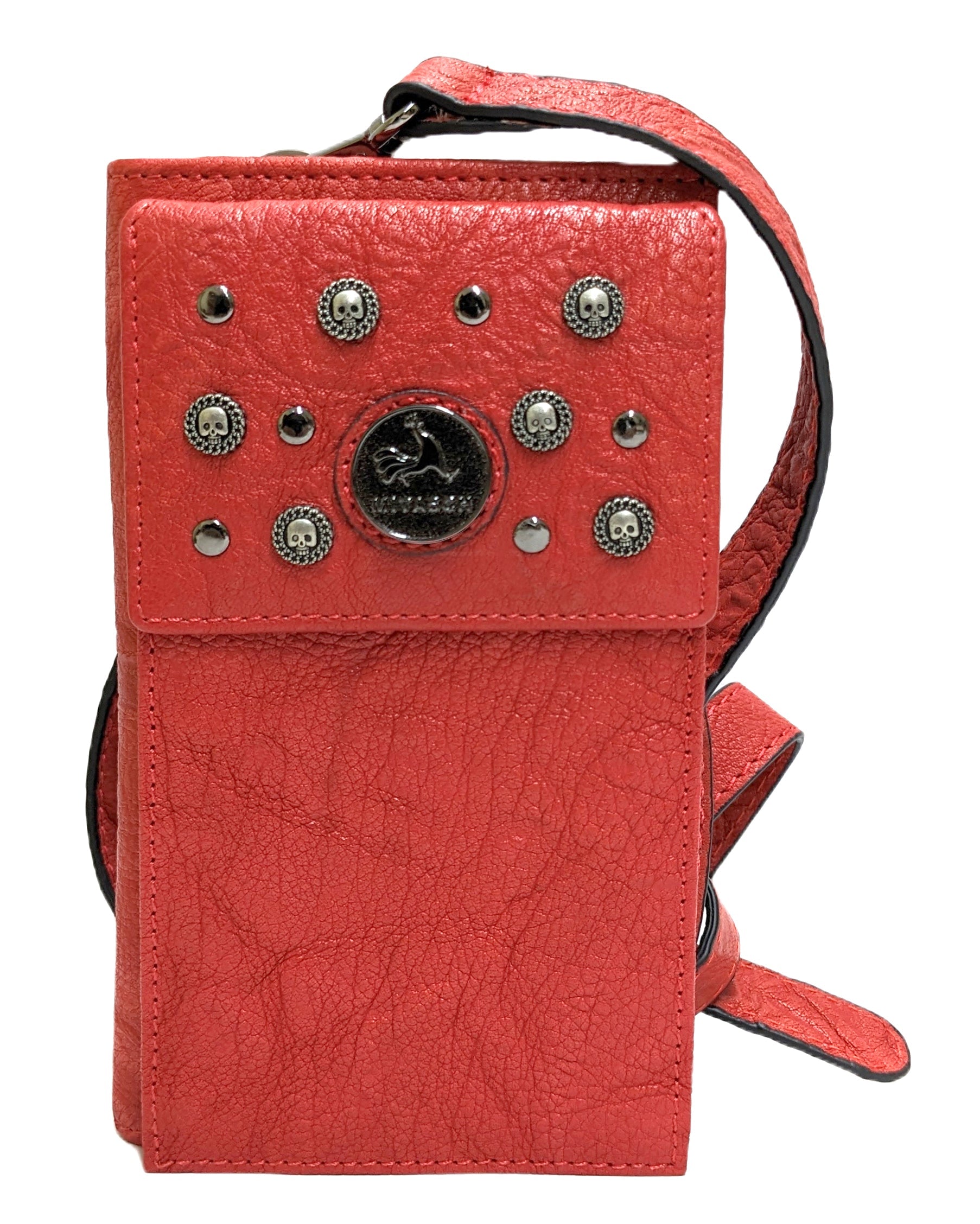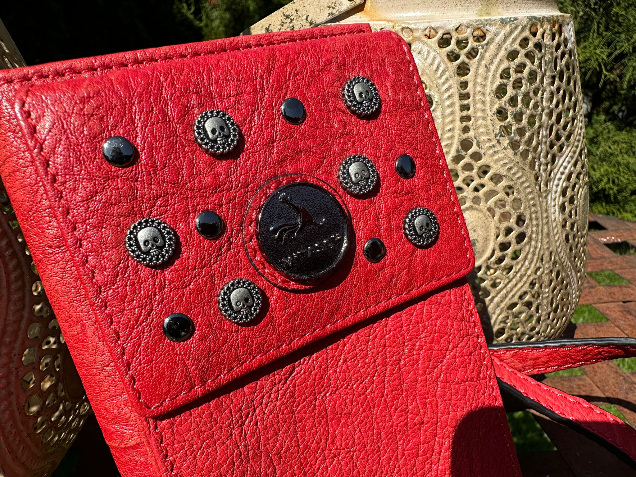 • Umhängetasche aus echtem Leder mit Handyfach. In rot mit einzigartigen Totenkopf-Nieten ist diese Handytasche der Hingucker und für den Alltag, aber auch für besondere Anlässe gut geeignet.