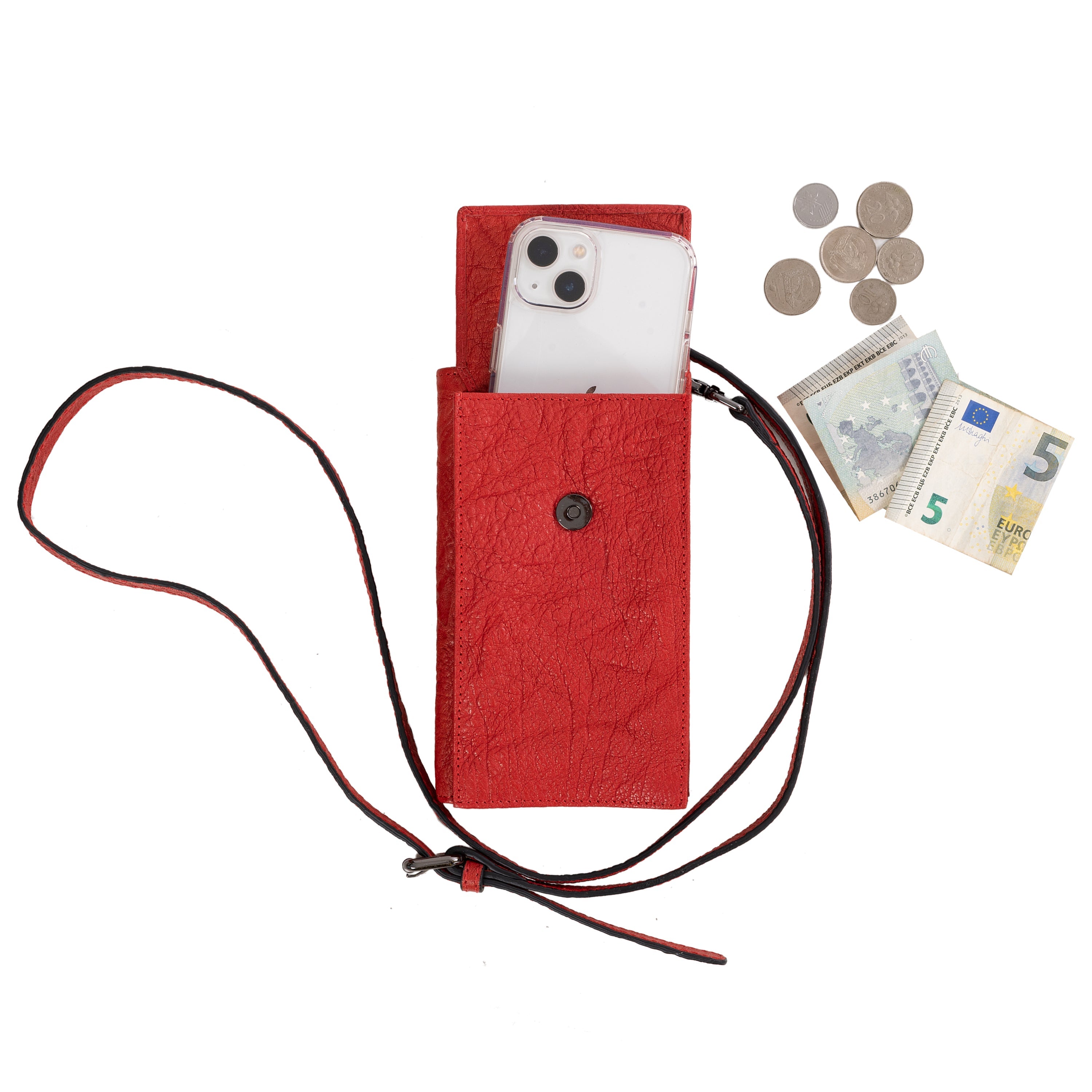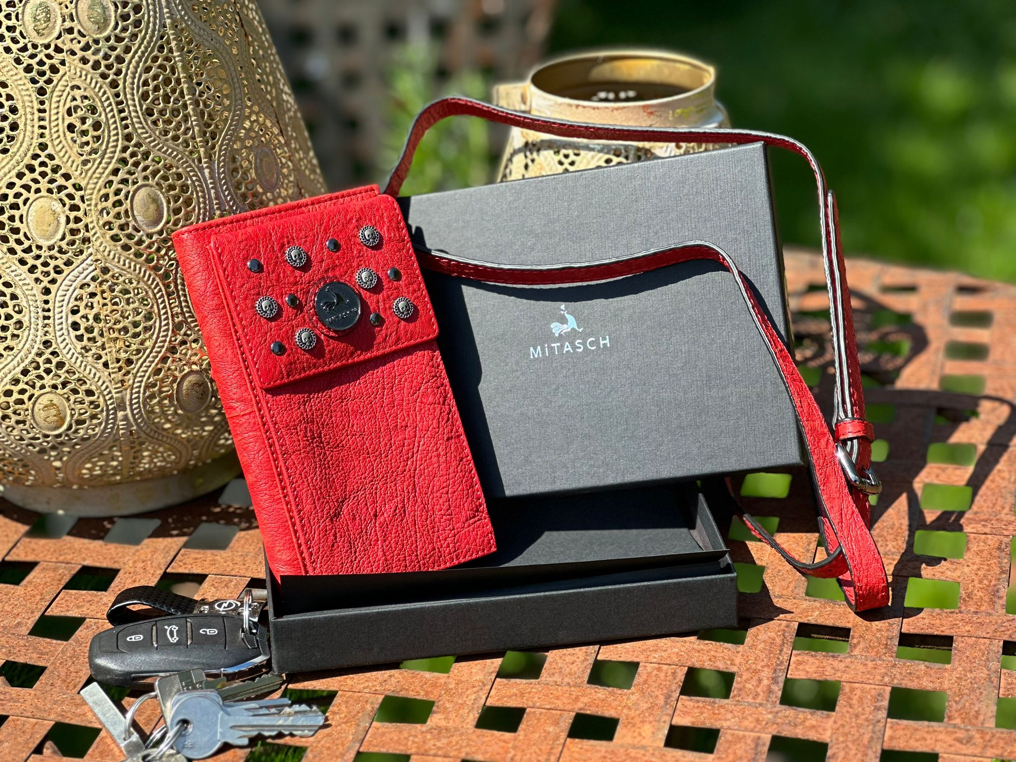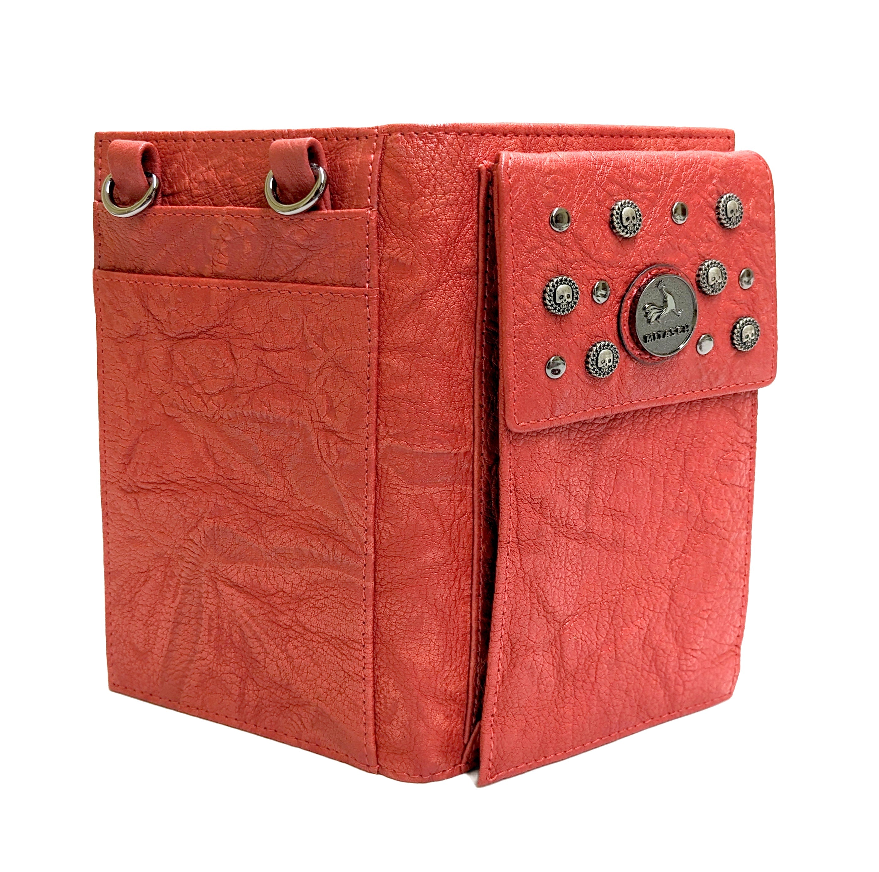• Umhängetasche aus echtem Leder mit Handyfach. In rot mit einzigartigen Totenkopf-Nieten ist diese Handytasche der Hingucker und für den Alltag, aber auch für besondere Anlässe gut geeignet.