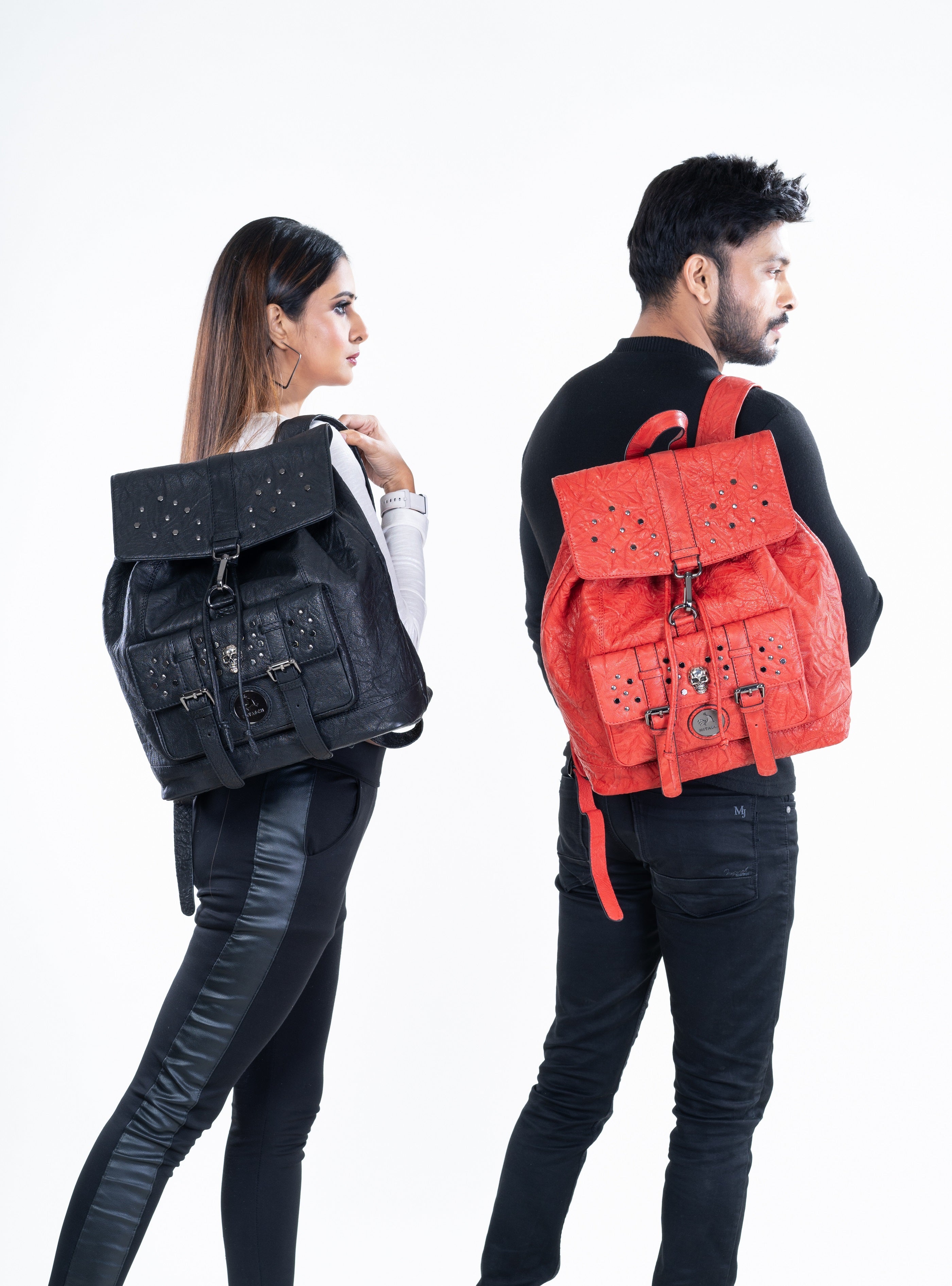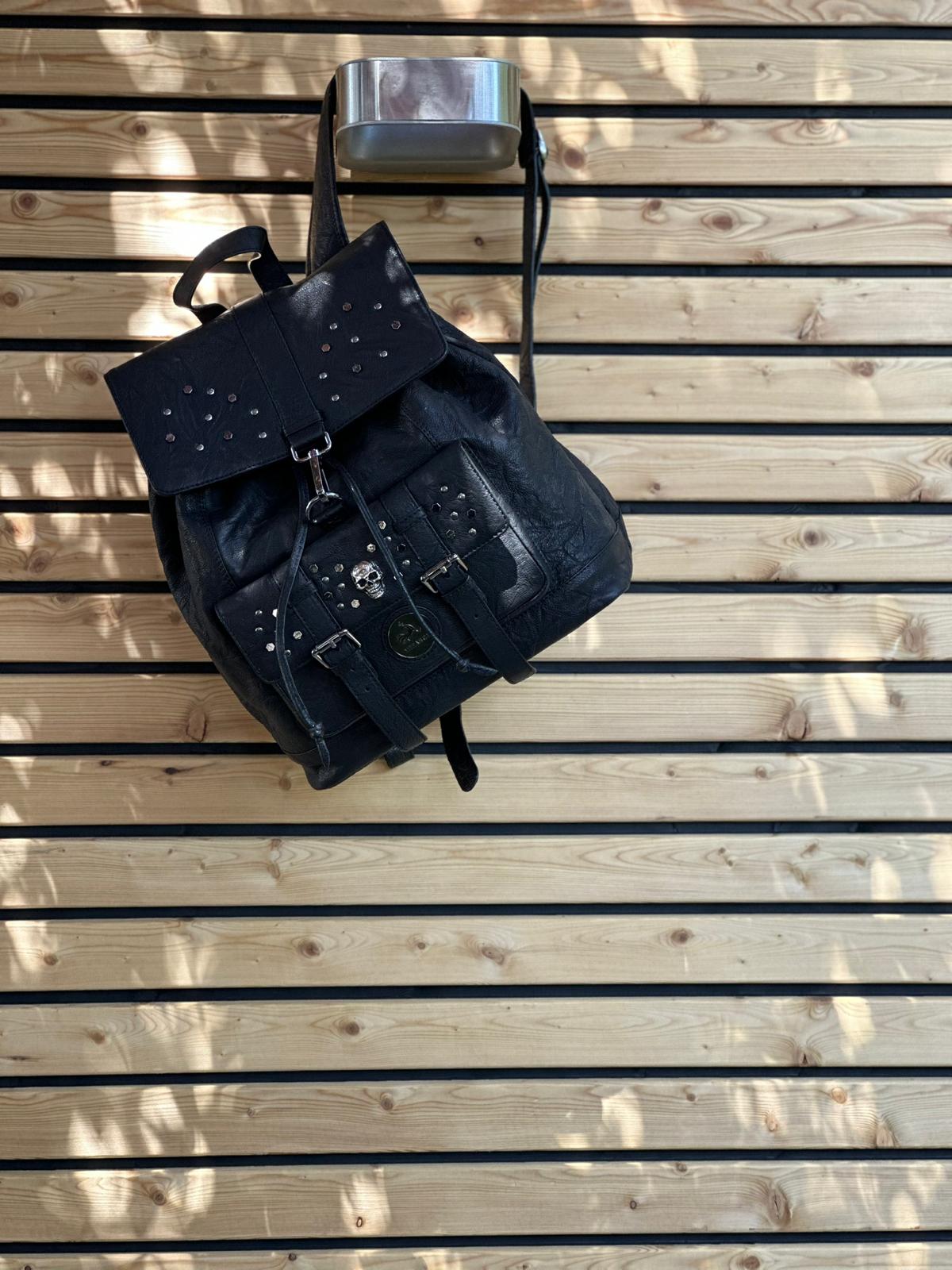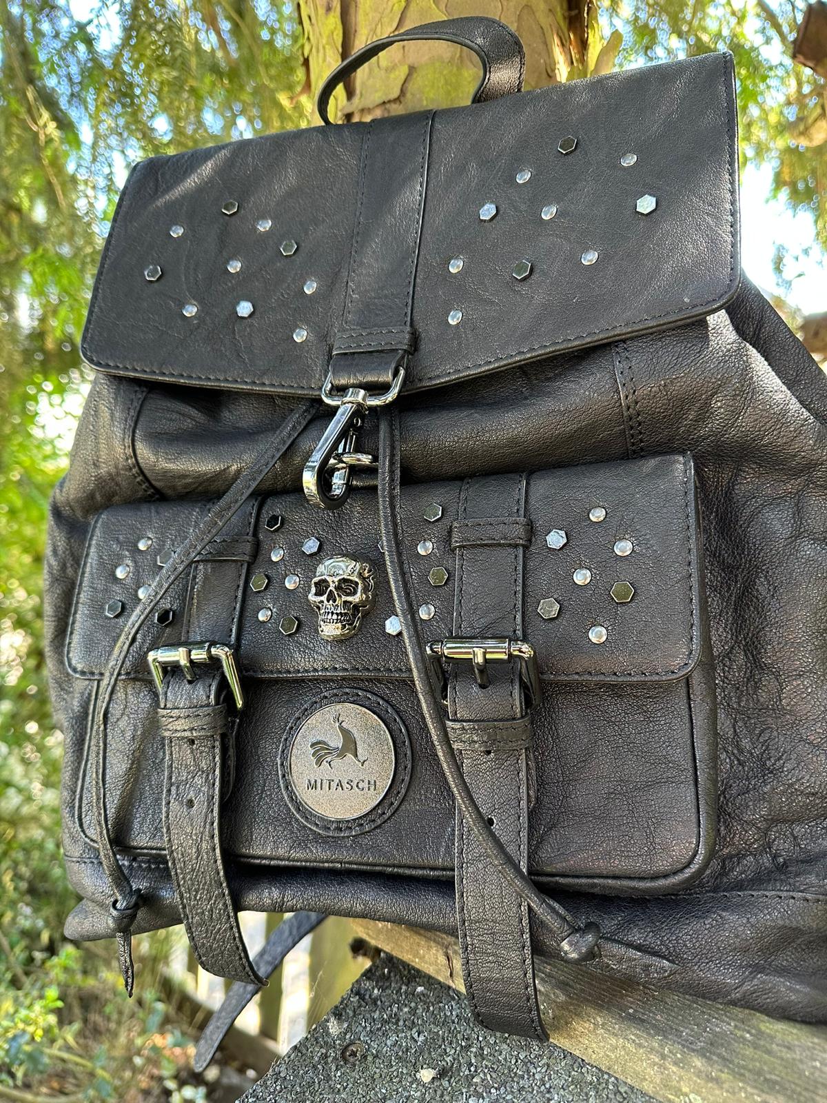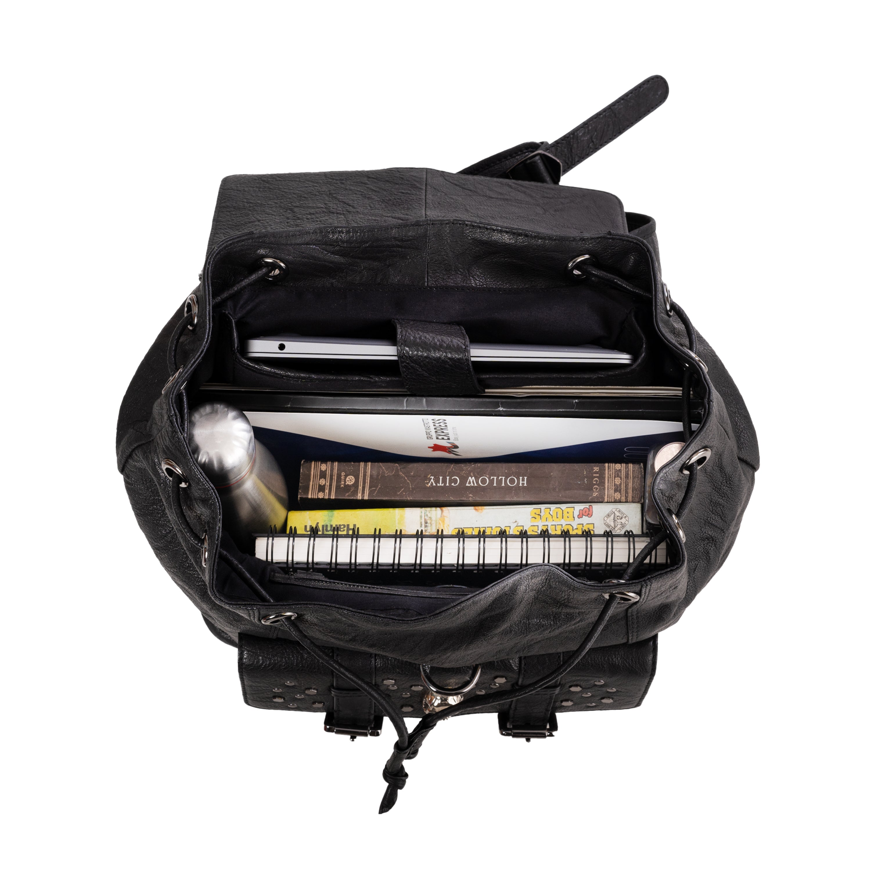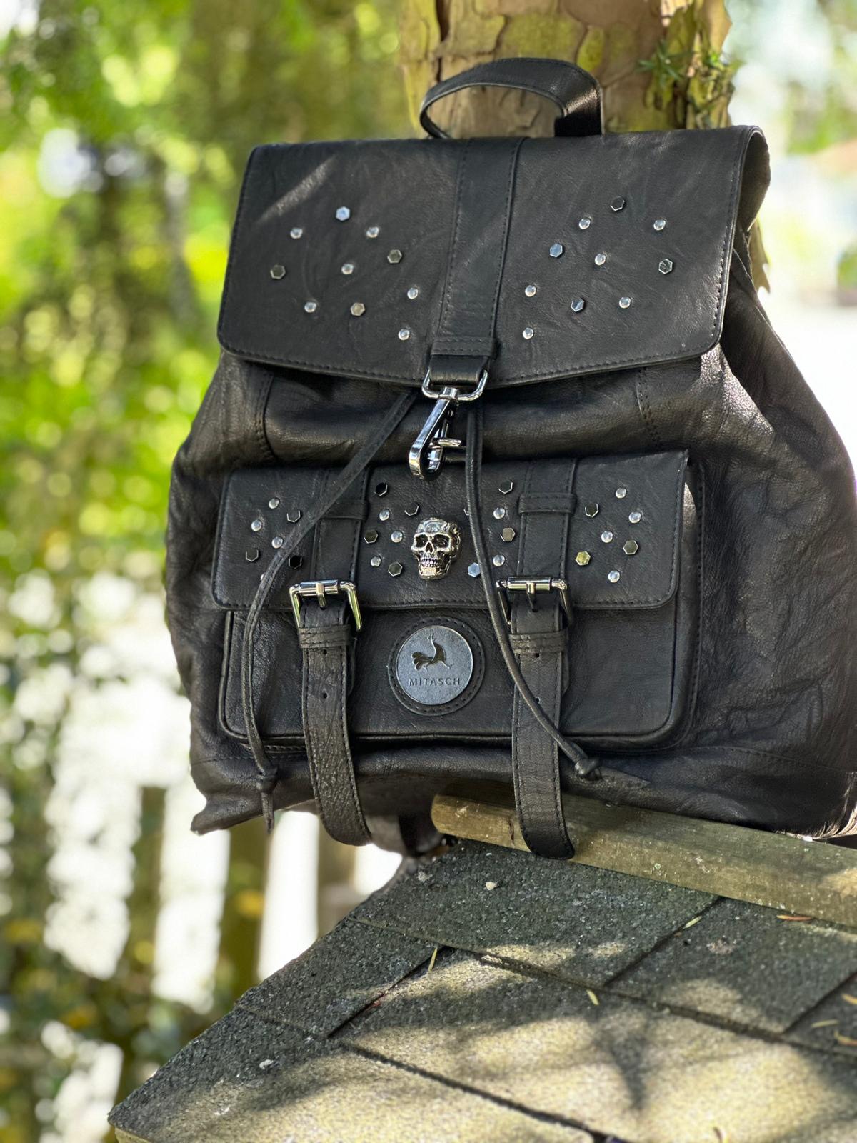 • Dieser Lederrucksack für Damen und Herren in schwarz ist mit seinem extravaganten Design, aber toller Funktionalität, der perfekte Begleiter im Alltag oder während einer Reise. Mit den silbernen Nieten ist dieser Rucksack der Hingucker.