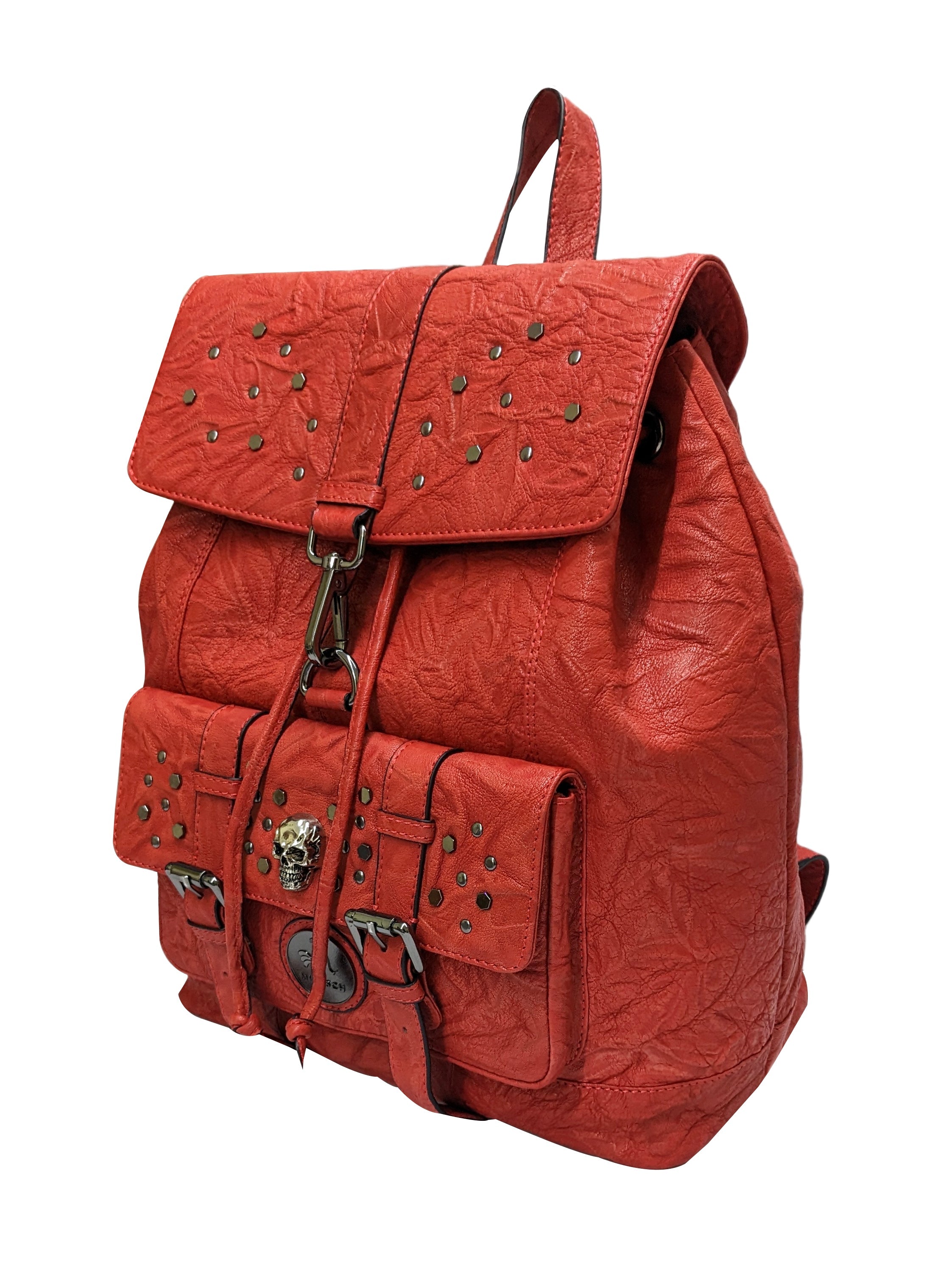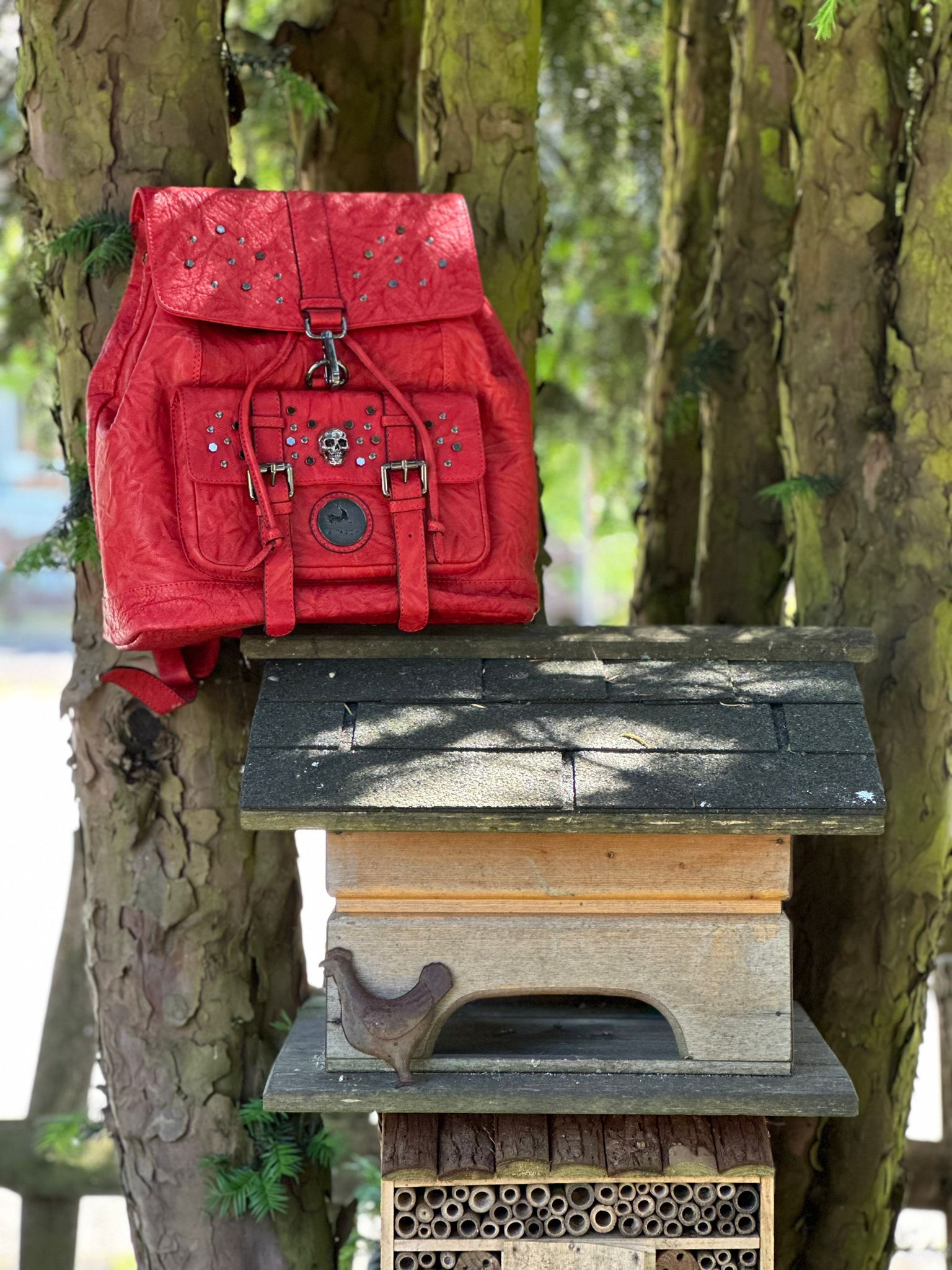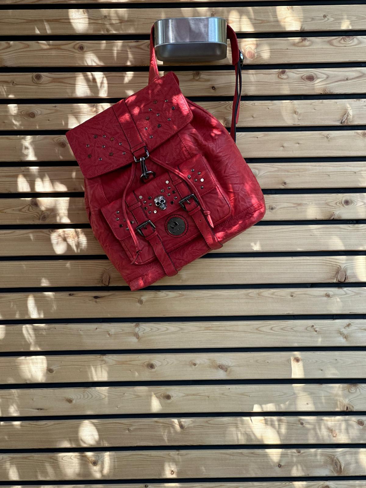 • Dieser Lederrucksack für Damen und Herren in rot ist mit seinem extravaganten Design, aber toller Funktionalität, der perfekte Begleiter im Alltag, während einer Reise oder einem besonderen Event. Mit den silbernen Nieten ist dieser Rucksack der Hingucker.