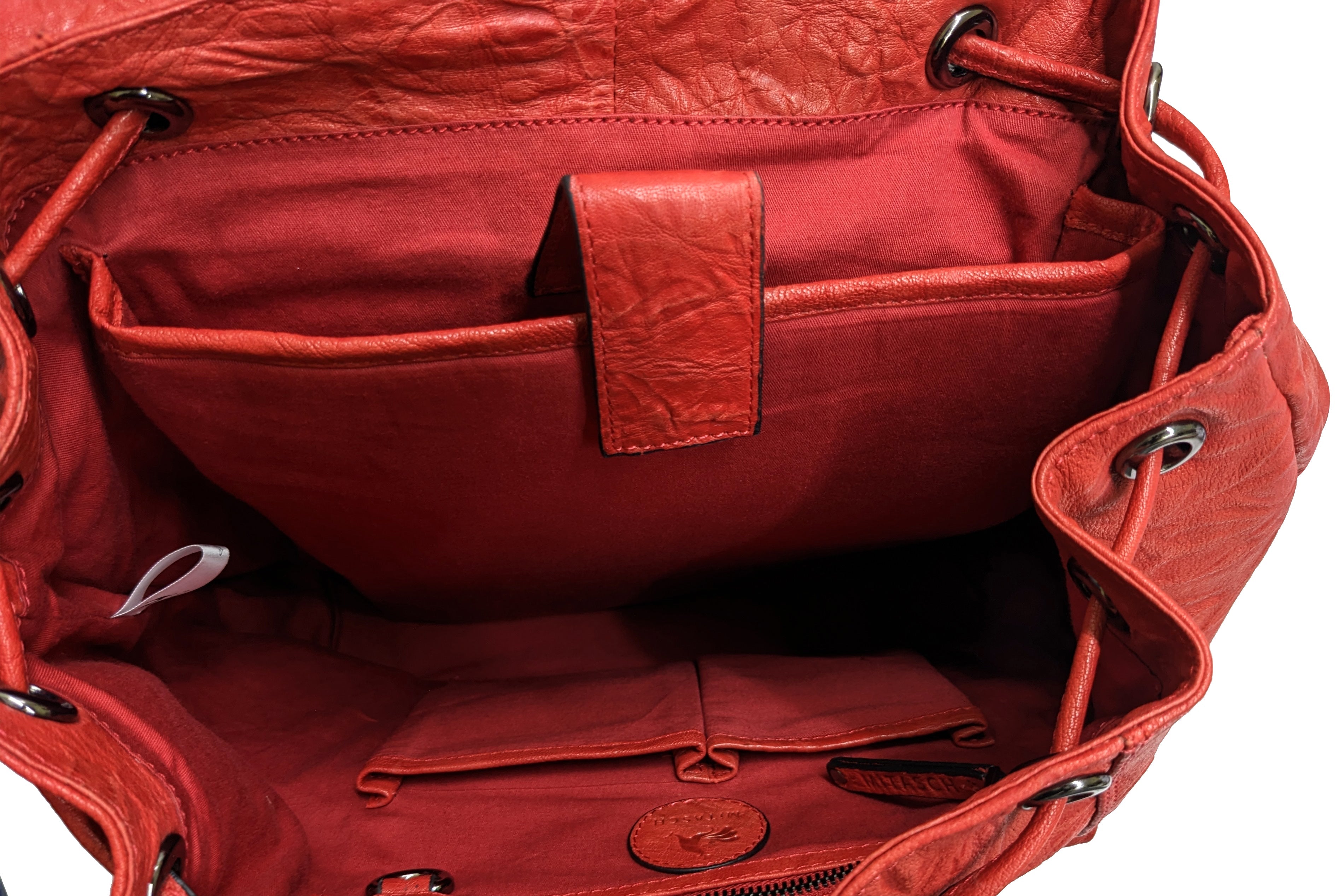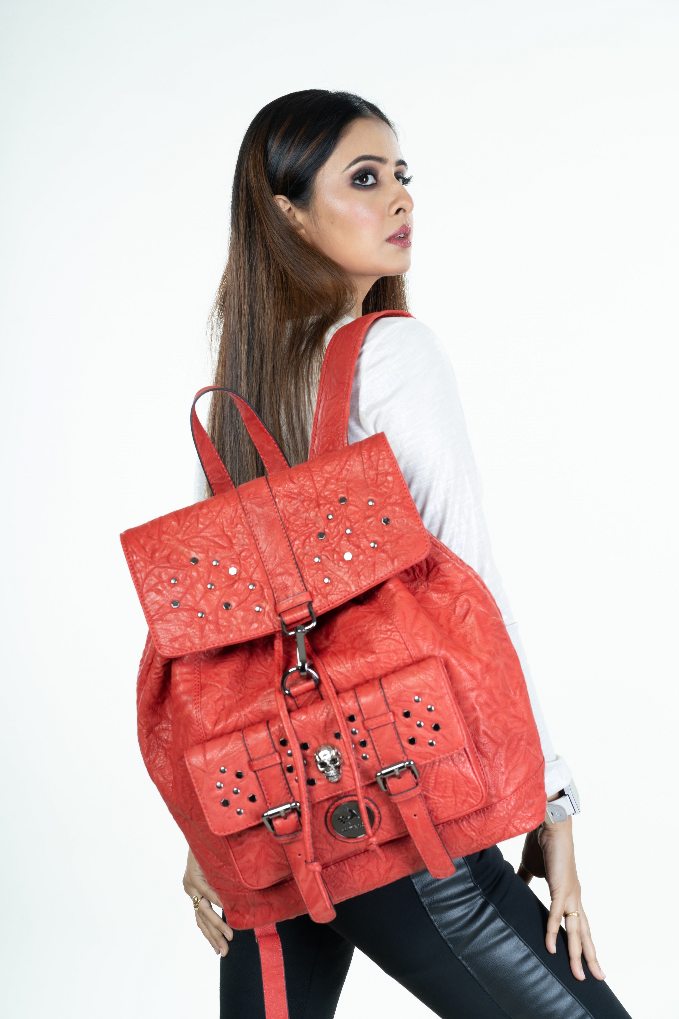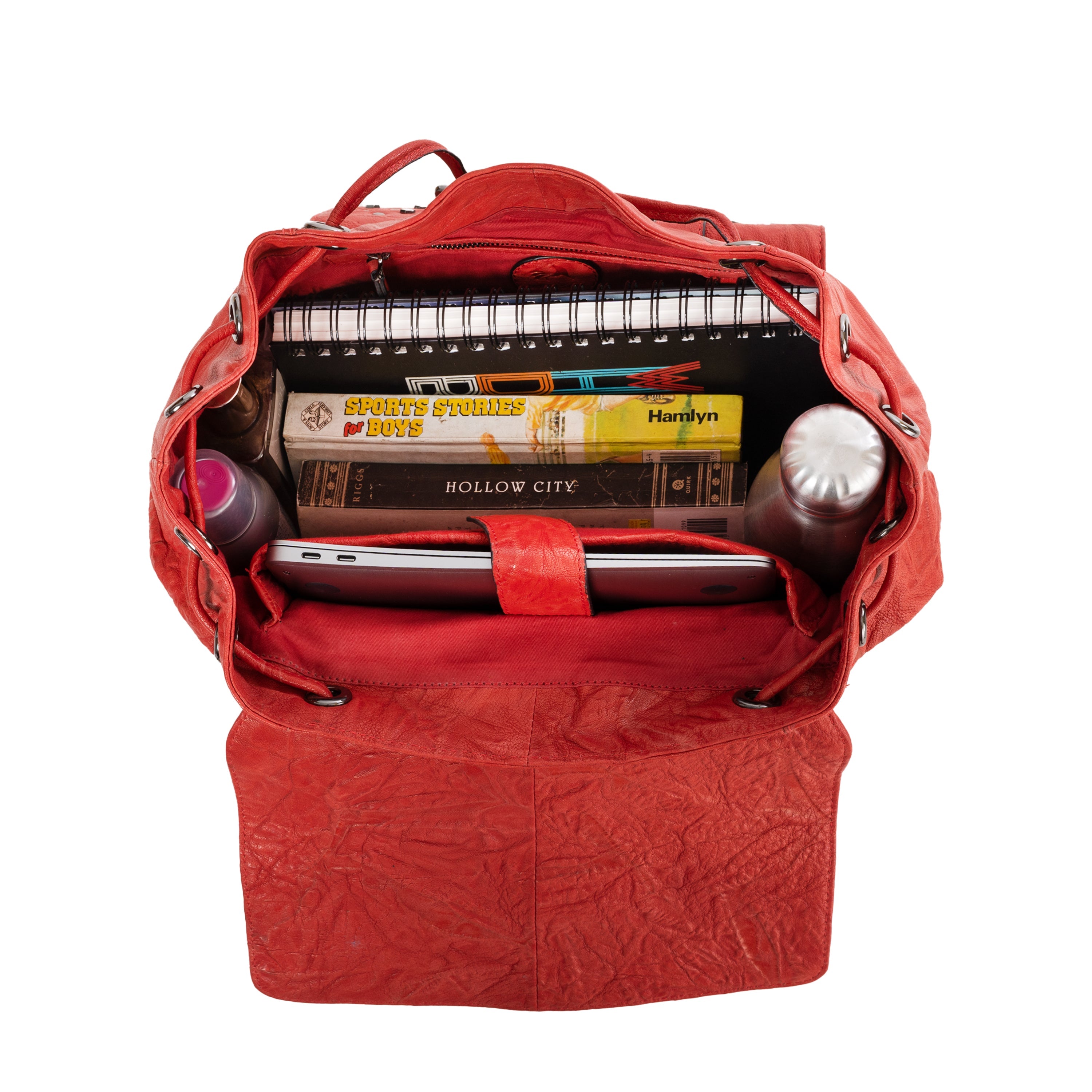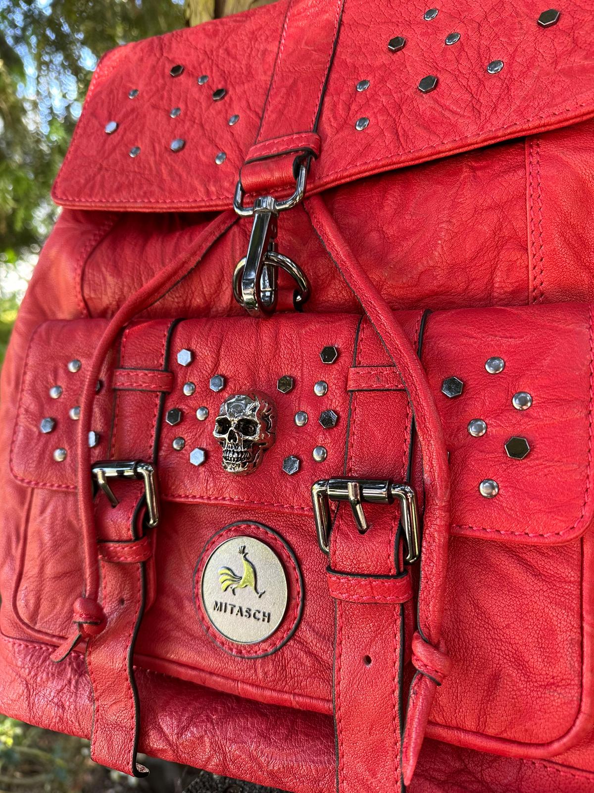 • Dieser Lederrucksack für Damen und Herren in rot ist mit seinem extravaganten Design, aber toller Funktionalität, der perfekte Begleiter im Alltag, während einer Reise oder einem besonderen Event. Mit den silbernen Nieten ist dieser Rucksack der Hingucker.