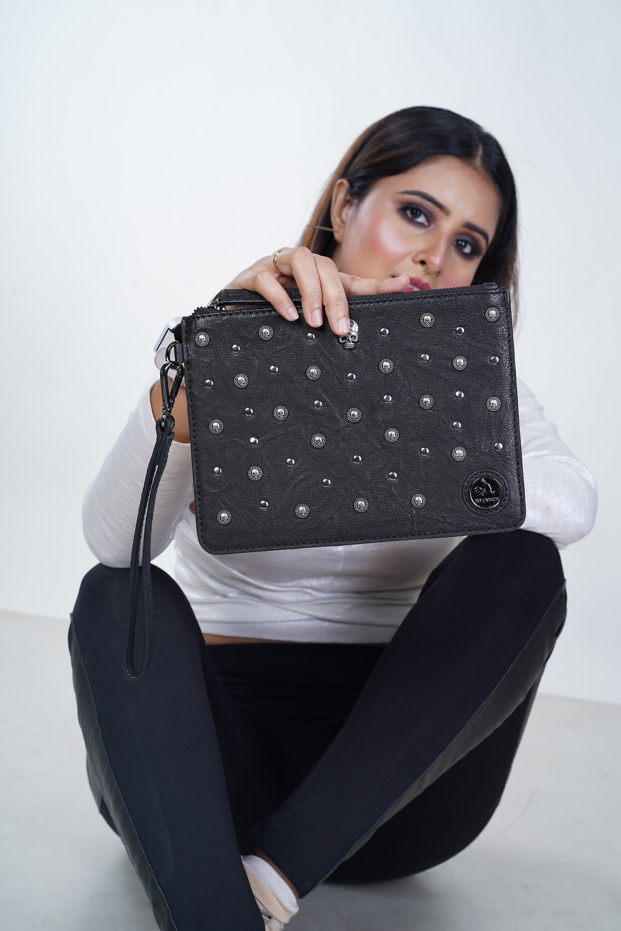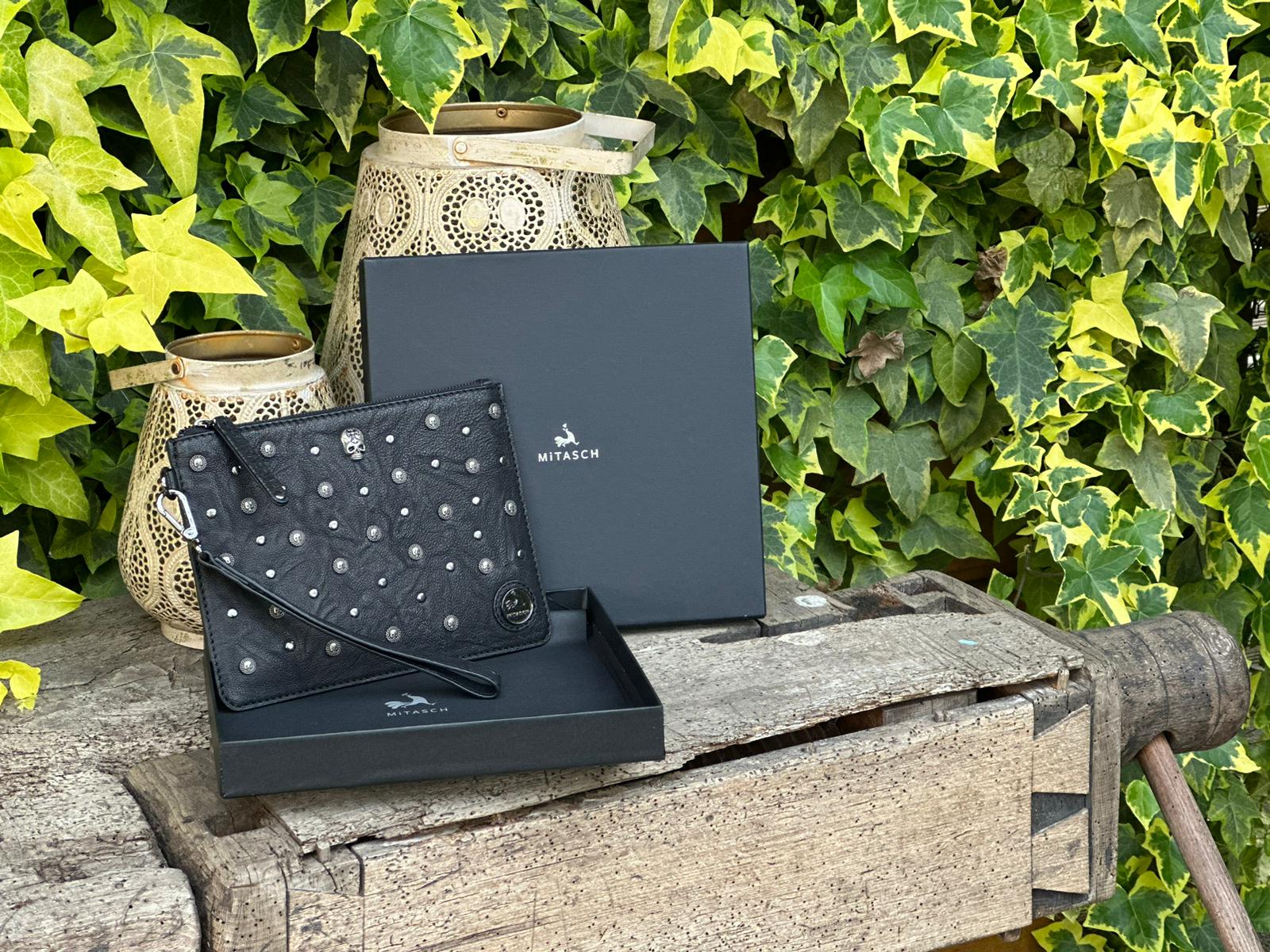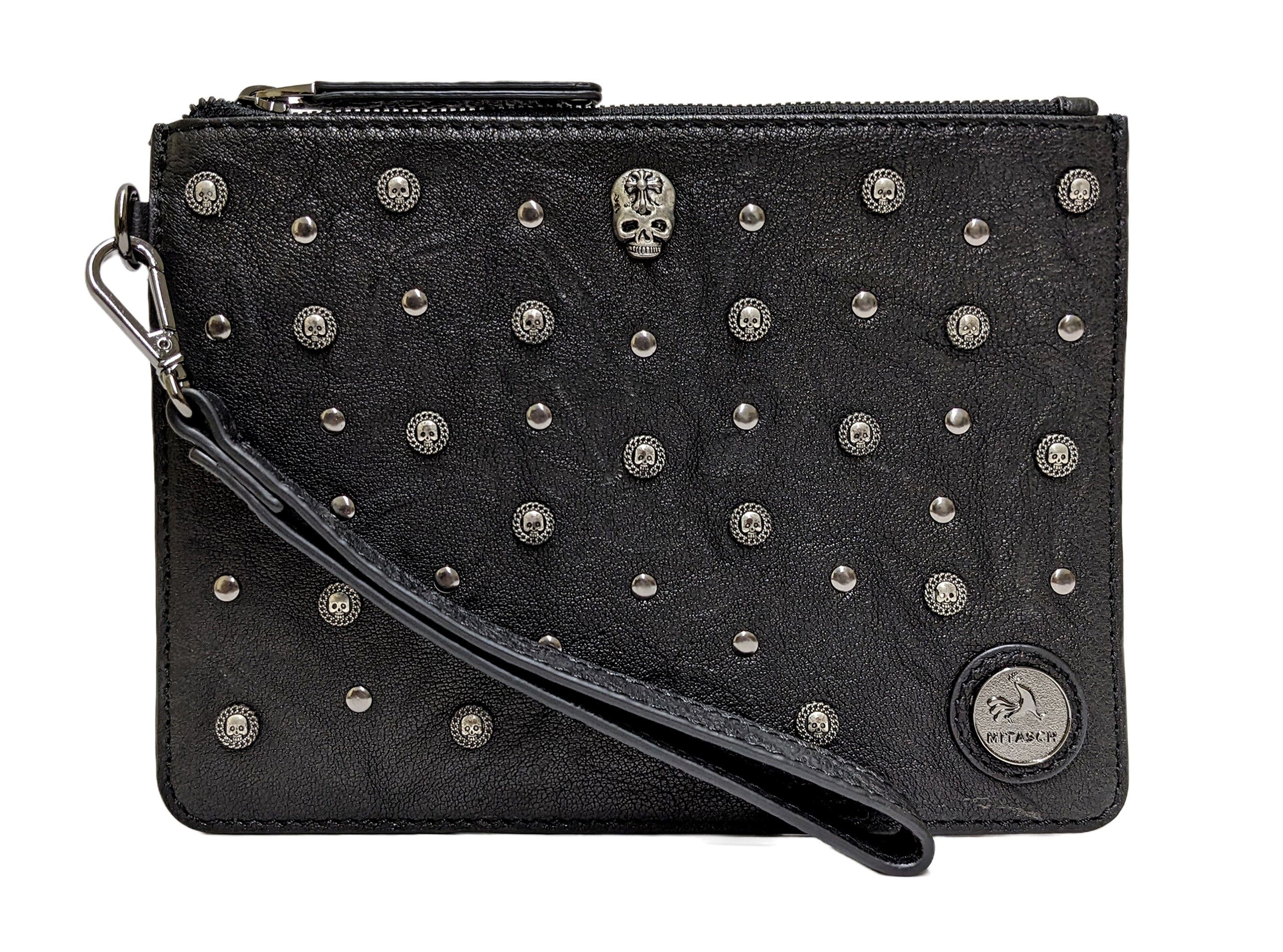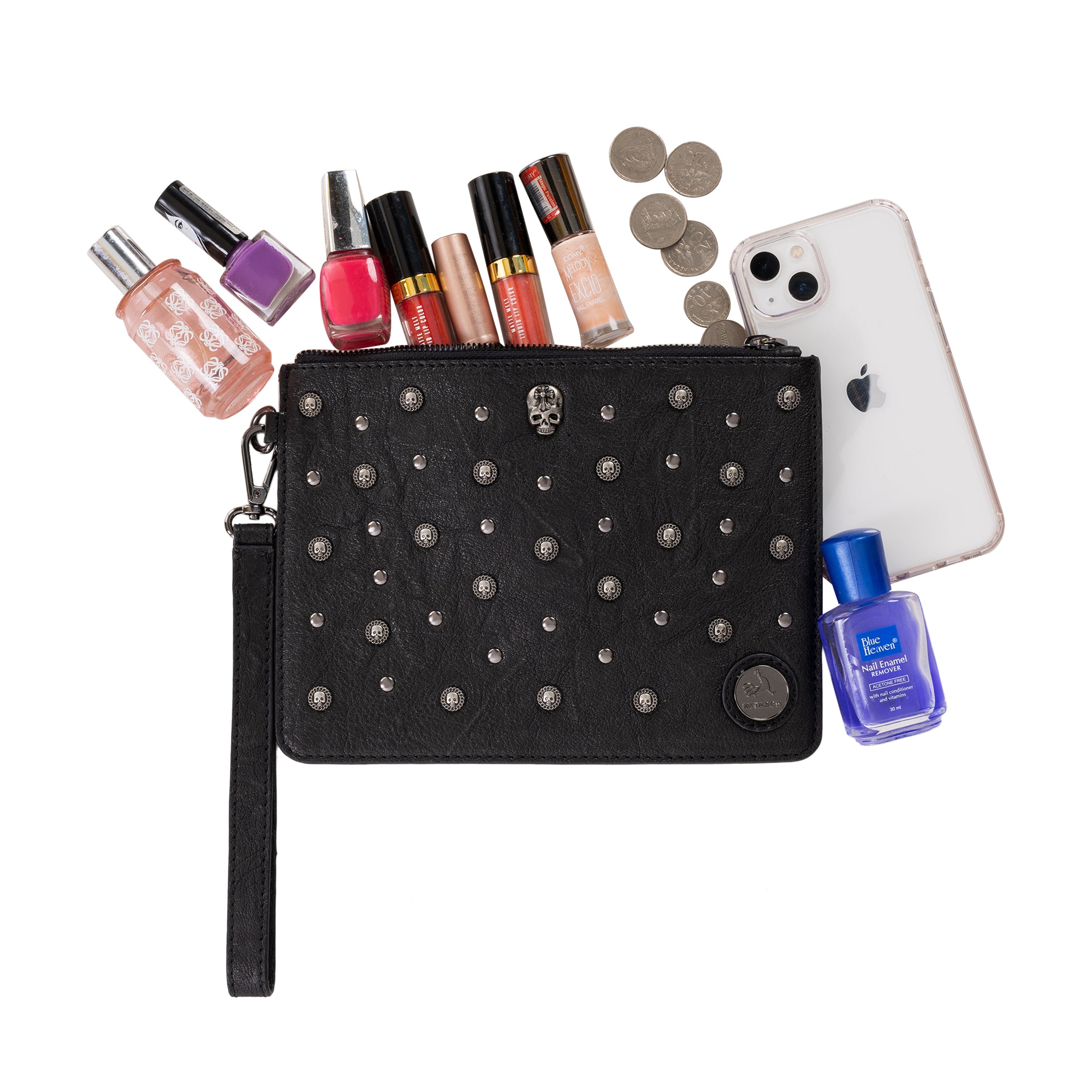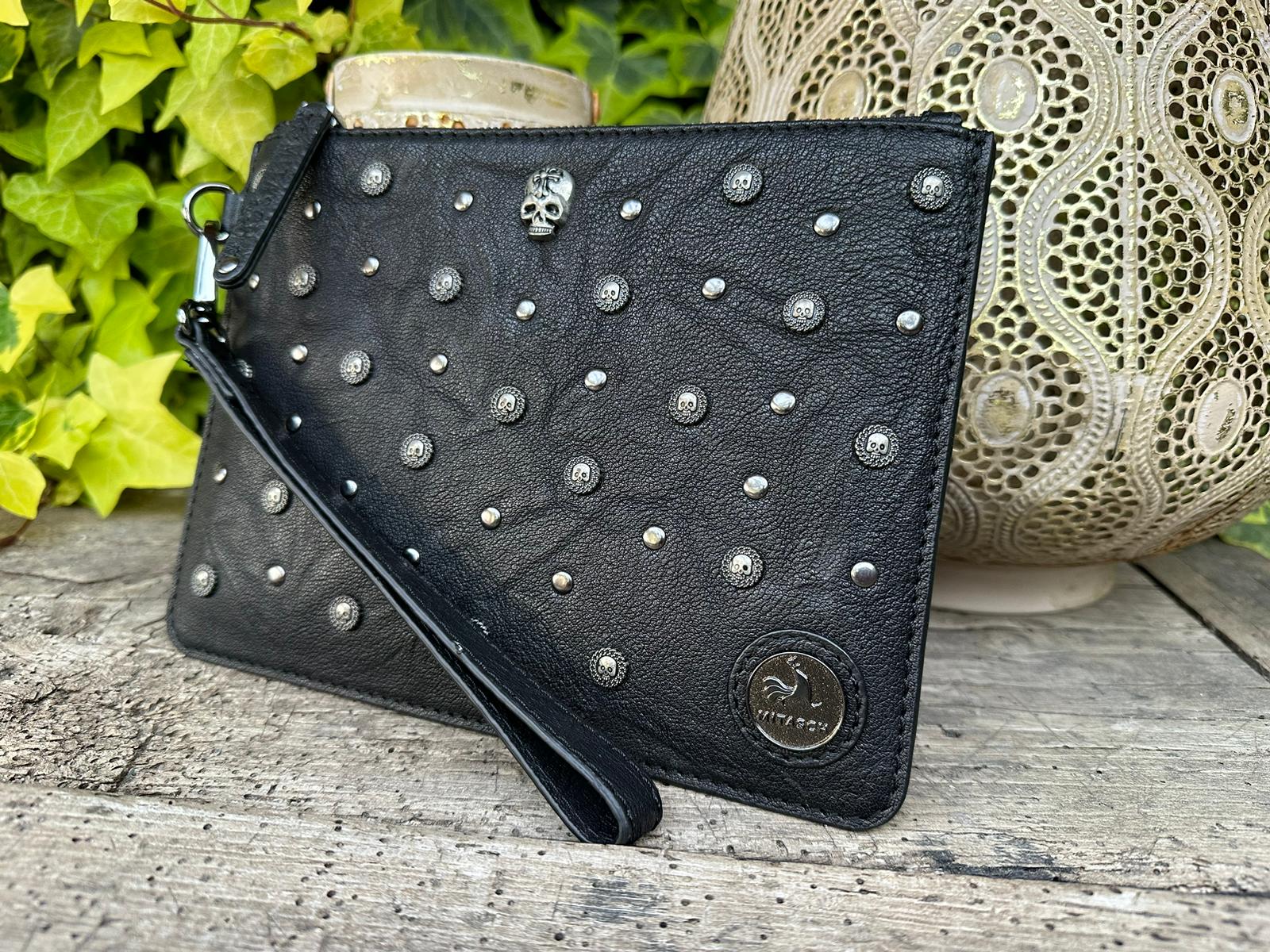 • Die Tasche in schwarz ist mit ihrem extravaganten Design, aber toller Funktionalität, der perfekte Begleiter im Alltag. Mit den silbernen Skull-Nieten ist diese Pouch der Hingucker.